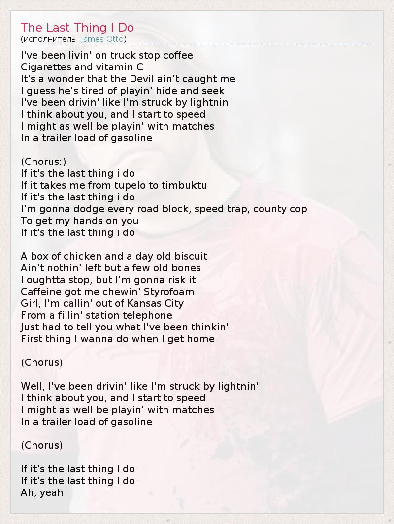 I've been livin' on truck stop coffee Cigarettes and vitamin C It's a wonder that the Devil ain't caught me I guess he's tired of playin' hide and seek I've been drivin' like I'm struck by lightnin' I think about you, and I start to speed I might as well be playin' with matches In a trailer load of gasoline (Chorus:) If it's the last thing i do If it takes me from tupelo to timbuktu If it's the last thing i do I'm gonna dodge every road block, speed trap, county cop To get my hands on you If it's the last thing i do A box of chicken and a day old biscuit Ain't nothin' left but a few old bones I oughtta stop, but I'm gonna risk it Caffeine got me chewin' Styrofoam Girl, I'm callin' out of Kansas City From a fillin' station telephone Just had to tell you what I've been thinkin' First thing I wanna do when I get home (Chorus) Well, I've been drivin' like I'm struck by lightnin' I think about you, and I start to speed I might as well be playin' with matches In a trailer load of gasoline (Chorus) If it's the last thing I do If it's the last thing I do Ah, yeah