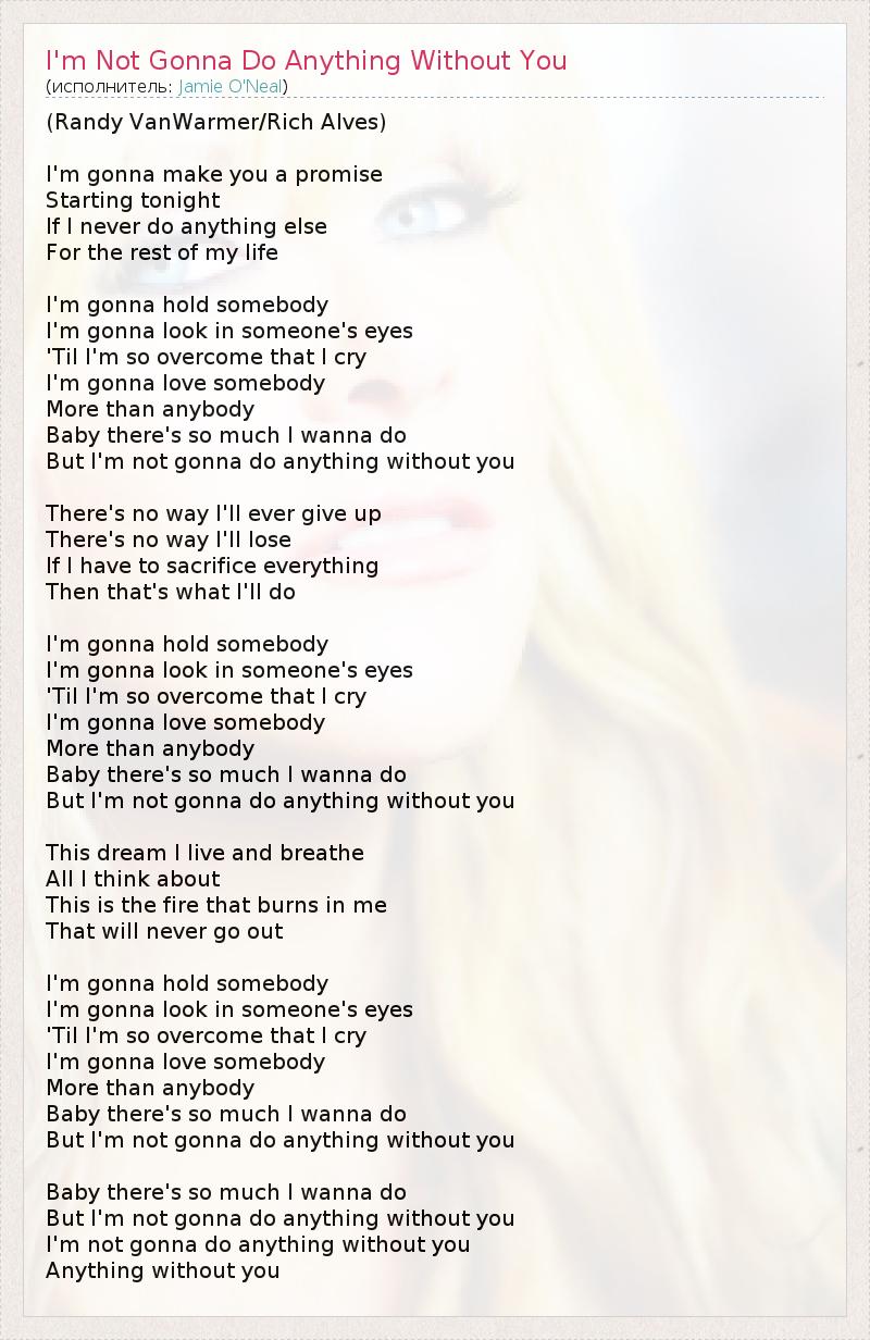 (Randy VanWarmer/Rich Alves) I'm gonna make you a promise Starting tonight If I never do anything else For the rest of my life I'm gonna hold somebody I'm gonna look in someone's eyes 'Til I'm so overcome that I cry I'm gonna love somebody More than anybody Baby there's so much I wanna do But I'm not gonna do anything without you There's no way I'll ever give up There's no way I'll lose If I have to sacrifice everything Then that's what I'll do I'm gonna hold somebody I'm gonna look in someone's eyes 'Til I'm so overcome that I cry I'm gonna love somebody More than anybody Baby there's so much I wanna do But I'm not gonna do anything without you This dream I live and breathe All I think about This is the fire that burns in me That will never go out I'm gonna hold somebody I'm gonna look in someone's eyes 'Til I'm so overcome that I cry I'm gonna love somebody More than anybody Baby there's so much I wanna do But I'm not gonna do anything without you Baby there's so much I wanna do But I'm not gonna do anything without you I'm not gonna do anything without you Anything without you