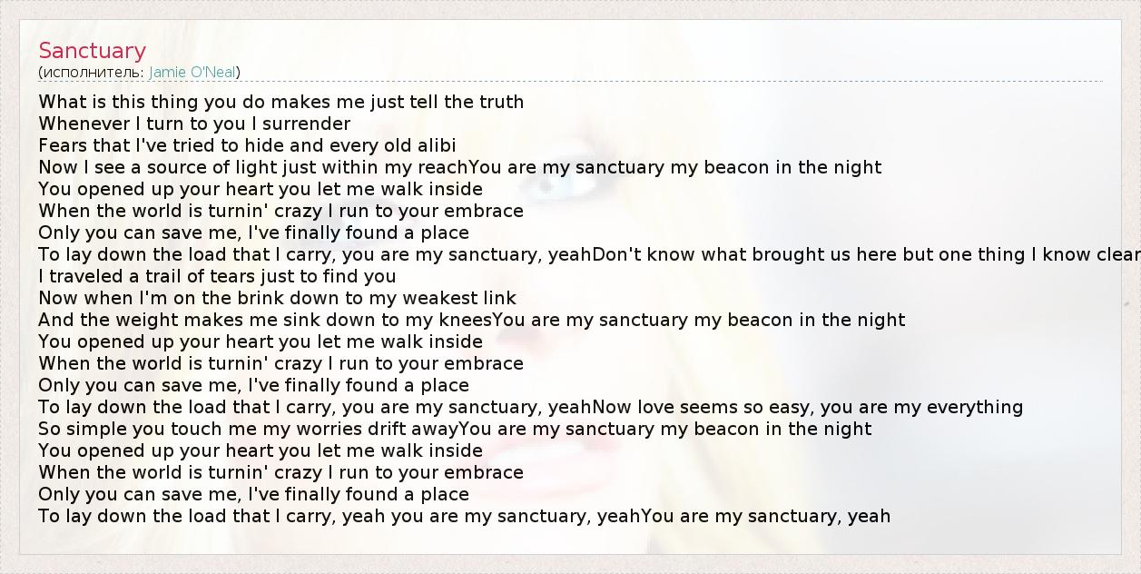 What is this thing you do makes me just tell the truth Whenever I turn to you I surrender Fears that I've tried to hide and every old alibi Now I see a source of light just within my reachYou are my sanctuary my beacon in the night You opened up your heart you let me walk inside When the world is turnin' crazy I run to your embrace Only you can save me, I've finally found a place To lay down the load that I carry, you are my sanctuary, yeahDon't know what brought us here but one thing I know clear I traveled a trail of tears just to find you Now when I'm on the brink down to my weakest link And the weight makes me sink down to my kneesYou are my sanctuary my beacon in the night You opened up your heart you let me walk inside When the world is turnin' crazy I run to your embrace Only you can save me, I've finally found a place To lay down the load that I carry, you are my sanctuary, yeahNow love seems so easy, you are my everything So simple you touch me my worries drift awayYou are my sanctuary my beacon in the night You opened up your heart you let me walk inside When the world is turnin' crazy I run to your embrace Only you can save me, I've finally found a place To lay down the load that I carry, yeah you are my sanctuary, yeahYou are my sanctuary, yeah