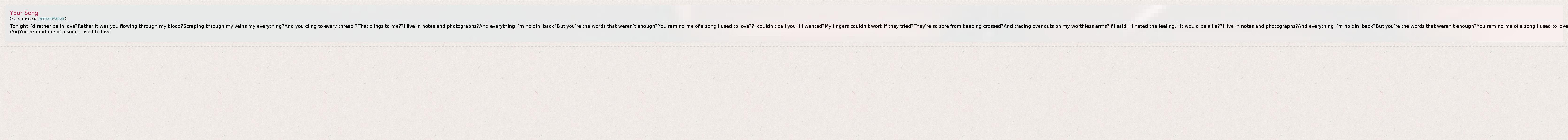Tonight I'd rather be in love?Rather it was you flowing through my blood?Scraping through my veins my everything?And you cling to every thread ?That clings to me??I live in notes and photographs?And everything I'm holdin' back?But you're the words that weren't enough?You remind me of a song I used to love??I couldn't call you if I wanted?My fingers couldn't work if they tried?They're so sore from keeping crossed?And tracing over cuts on my worthless arms?If I said, "I hated the feeling," it would be a lie??I live in notes and photographs?And everything I'm holdin' back?But you're the words that weren't enough?You remind me of a song I used to love (5x)You remind me of a song I used to love