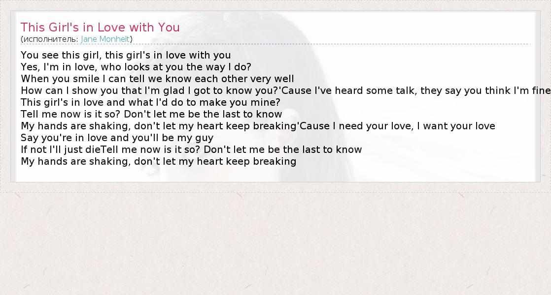 You see this girl, this girl's in love with you Yes, I'm in love, who looks at you the way I do? When you smile I can tell we know each other very well How can I show you that I'm glad I got to know you?'Cause I've heard some talk, they say you think I'm fine This girl's in love and what I'd do to make you mine? Tell me now is it so? Don't let me be the last to know My hands are shaking, don't let my heart keep breaking'Cause I need your love, I want your love Say you're in love and you'll be my guy If not I'll just dieTell me now is it so? Don't let me be the last to know My hands are shaking, don't let my heart keep breaking