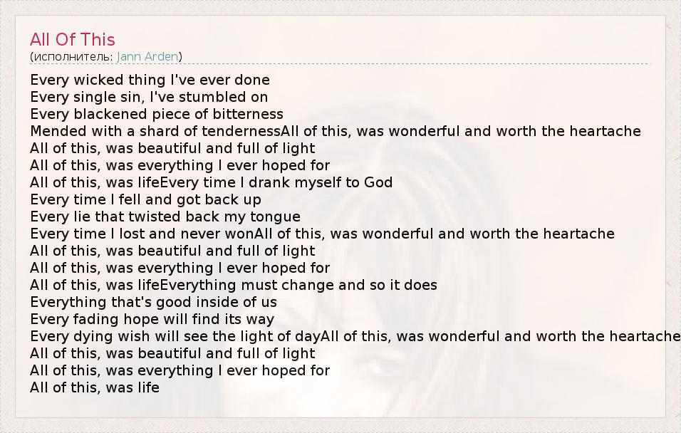 Every wicked thing I've ever done Every single sin, I've stumbled on Every blackened piece of bitterness Mended with a shard of tendernessAll of this, was wonderful and worth the heartache All of this, was beautiful and full of light All of this, was everything I ever hoped for All of this, was lifeEvery time I drank myself to God Every time I fell and got back up Every lie that twisted back my tongue Every time I lost and never wonAll of this, was wonderful and worth the heartache All of this, was beautiful and full of light All of this, was everything I ever hoped for All of this, was lifeEverything must change and so it does Everything that's good inside of us Every fading hope will find its way Every dying wish will see the light of dayAll of this, was wonderful and worth the heartache All of this, was beautiful and full of light All of this, was everything I ever hoped for All of this, was life