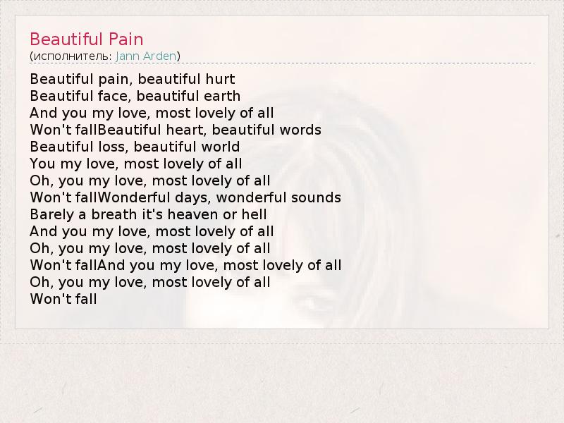Beautiful pain, beautiful hurt Beautiful face, beautiful earth And you my love, most lovely of all Won't fallBeautiful heart, beautiful words Beautiful loss, beautiful world You my love, most lovely of all Oh, you my love, most lovely of all Won't fallWonderful days, wonderful sounds Barely a breath it's heaven or hell And you my love, most lovely of all Oh, you my love, most lovely of all Won't fallAnd you my love, most lovely of all Oh, you my love, most lovely of all Won't fall