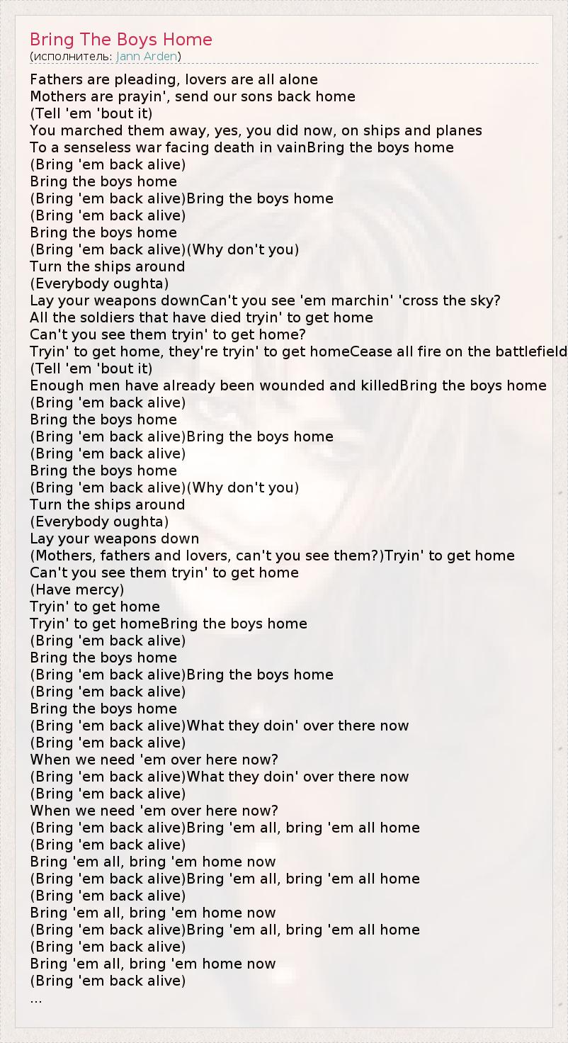 А как ты думаешь, о чем песня "Bring The Boys Home" ?