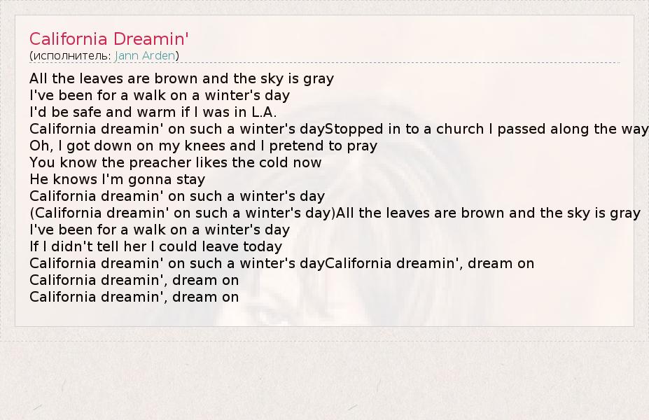 All the leaves are brown and the sky is gray I've been for a walk on a winter's day I'd be safe and warm if I was in L.A. California dreamin' on such a winter's dayStopped in to a church I passed along the way Oh, I got down on my knees and I pretend to pray You know the preacher likes the cold now He knows I'm gonna stay California dreamin' on such a winter's day (California dreamin' on such a winter's day)All the leaves are brown and the sky is gray I've been for a walk on a winter's day If I didn't tell her I could leave today California dreamin' on such a winter's dayCalifornia dreamin', dream on California dreamin', dream on California dreamin', dream on