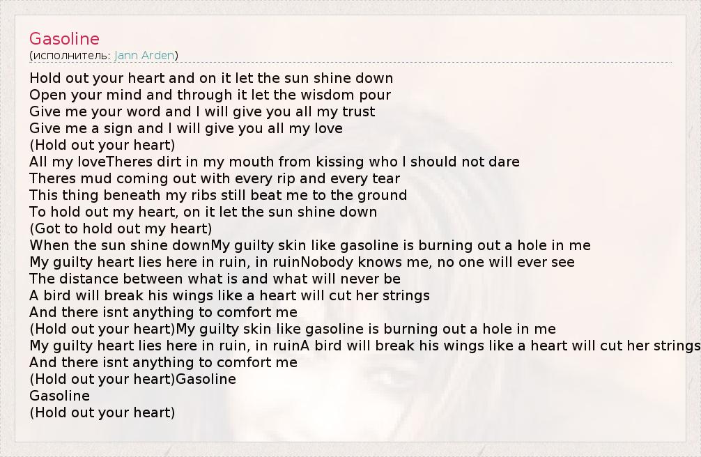 Hold out your heart and on it let the sun shine down Open your mind and through it let the wisdom pour Give me your word and I will give you all my trust Give me a sign and I will give you all my love (Hold out your heart) All my loveTheres dirt in my mouth from kissing who I should not dare Theres mud coming out with every rip and every tear This thing beneath my ribs still beat me to the ground To hold out my heart, on it let the sun shine down (Got to hold out my heart) When the sun shine downMy guilty skin like gasoline is burning out a hole in me My guilty heart lies here in ruin, in ruinNobody knows me, no one will ever see The distance between what is and what will never be A bird will break his wings like a heart will cut her strings And there isnt anything to comfort me (Hold out your heart)My guilty skin like gasoline is burning out a hole in me My guilty heart lies here in ruin, in ruinA bird will break his wings like a heart will cut her strings And there isnt anything to comfort me (Hold out your heart)Gasoline Gasoline (Hold out your heart)