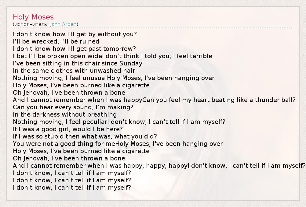 I don't know how I'll get by without you? I'll be wrecked, I'll be ruined I don't know how I'll get past tomorrow? I bet I'll be broken open wideI don't think I told you, I feel terrible I've been sitting in this chair since Sunday In the same clothes with unwashed hair Nothing moving, I feel unusualHoly Moses, I've been hanging over Holy Moses, I've been burned like a cigarette Oh Jehovah, I've been thrown a bone And I cannot remember when I was happyCan you feel my heart beating like a thunder ball? Can you hear every sound, I'm making? In the darkness without breathing Nothing moving, I feel peculiarI don't know, I can't tell if I am myself? If I was a good girl, would I be here? If I was so stupid then what was, what you did? You were not a good thing for meHoly Moses, I've been hanging over Holy Moses, I've been burned like a cigarette Oh Jehovah, I've been thrown a bone And I cannot remember when I was happy, happy, happyI don't know, I can't tell if I am myself? I don't know, I can't tell if I am myself? I don't know, I can't tell if I am myself? I don't know, I can't tell if I am myself?