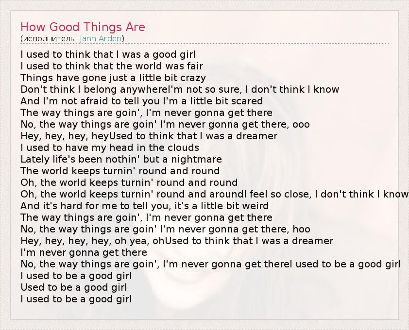 I used to think that I was a good girl I used to think that the world was fair Things have gone just a little bit crazy Don't think I belong anywhereI'm not so sure, I don't think I know And I'm not afraid to tell you I'm a little bit scared The way things are goin', I'm never gonna get there No, the way things are goin' I'm never gonna get there, ooo Hey, hey, hey, heyUsed to think that I was a dreamer I used to have my head in the clouds Lately life's been nothin' but a nightmare The world keeps turnin' round and round Oh, the world keeps turnin' round and round Oh, the world keeps turnin' round and aroundI feel so close, I don't think I know And it's hard for me to tell you, it's a little bit weird The way things are goin', I'm never gonna get there No, the way things are goin' I'm never gonna get there, hoo Hey, hey, hey, hey, oh yea, ohUsed to think that I was a dreamer I'm never gonna get there No, the way things are goin', I'm never gonna get thereI used to be a good girl I used to be a good girl Used to be a good girl I used to be a good girl