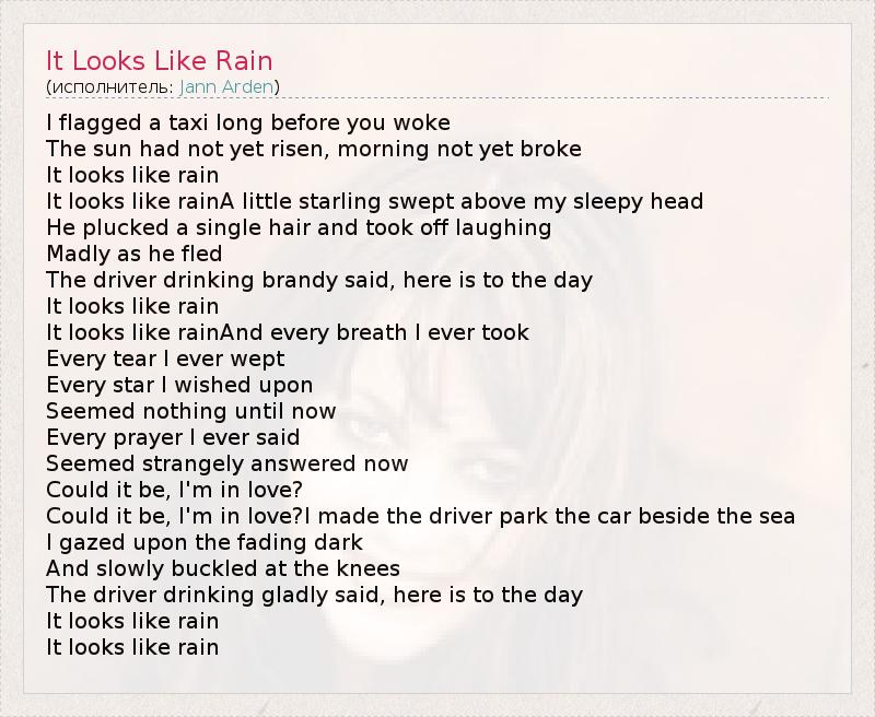 I flagged a taxi long before you woke The sun had not yet risen, morning not yet broke It looks like rain It looks like rainA little starling swept above my sleepy head He plucked a single hair and took off laughing Madly as he fled The driver drinking brandy said, here is to the day It looks like rain It looks like rainAnd every breath I ever took Every tear I ever wept Every star I wished upon Seemed nothing until now Every prayer I ever said Seemed strangely answered now Could it be, I'm in love? Could it be, I'm in love?I made the driver park the car beside the sea I gazed upon the fading dark And slowly buckled at the knees The driver drinking gladly said, here is to the day It looks like rain It looks like rain