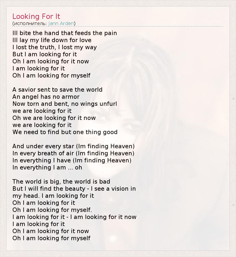 Ill bite the hand that feeds the pain Ill lay my life down for love I lost the truth, I lost my way But I am looking for it Oh I am looking for it now I am looking for it Oh I am looking for myself A savior sent to save the world An angel has no armor Now torn and bent, no wings unfurl we are looking for it Oh we are looking for it now we are looking for it We need to find but one thing good And under every star (Im finding Heaven) In every breath of air (Im finding Heaven) In everything I have (Im finding Heaven) In everything I am ... oh The world is big, the world is bad But I will find the beauty - I see a vision in my head. I am looking for it Oh I am looking for it Oh I am looking for myself. I am looking for it - I am looking for it now I am looking for it Oh I am looking for it now Oh I am looking for myself