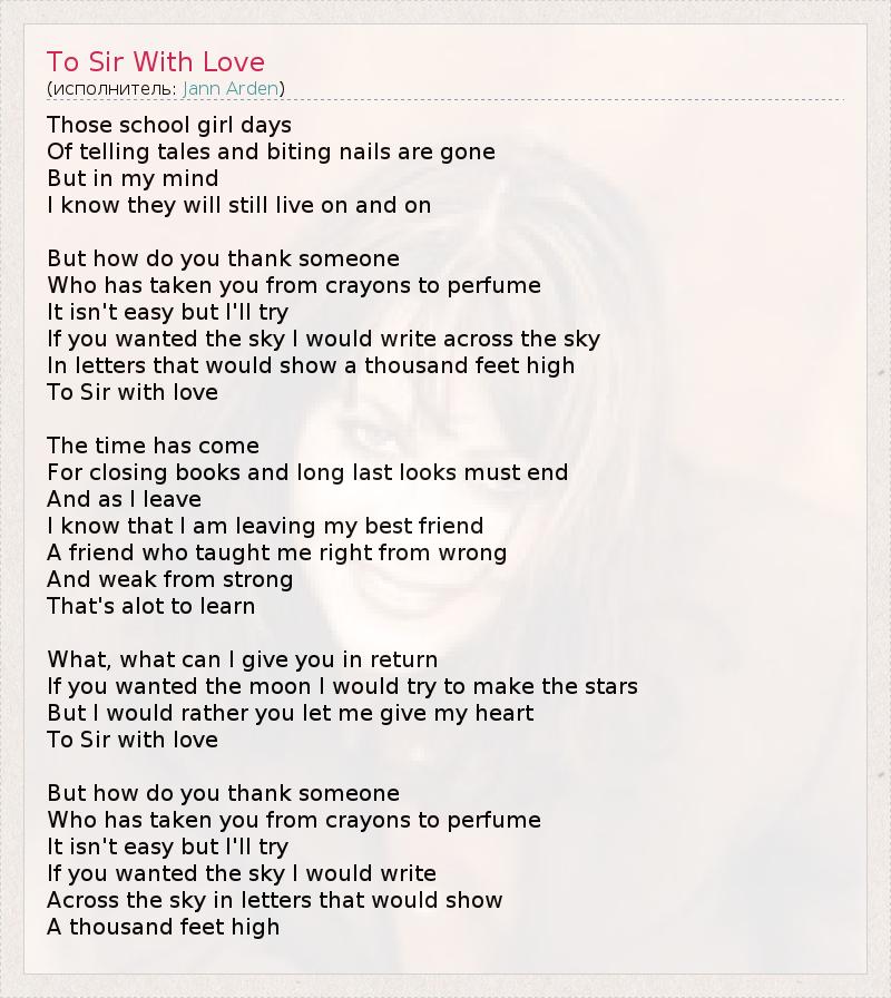 Those school girl days Of telling tales and biting nails are gone But in my mind I know they will still live on and on But how do you thank someone Who has taken you from crayons to perfume It isn't easy but I'll try If you wanted the sky I would write across the sky In letters that would show a thousand feet high To Sir with love The time has come For closing books and long last looks must end And as I leave I know that I am leaving my best friend A friend who taught me right from wrong And weak from strong That's alot to learn What, what can I give you in return If you wanted the moon I would try to make the stars But I would rather you let me give my heart To Sir with love But how do you thank someone Who has taken you from crayons to perfume It isn't easy but I'll try If you wanted the sky I would write Across the sky in letters that would show A thousand feet high