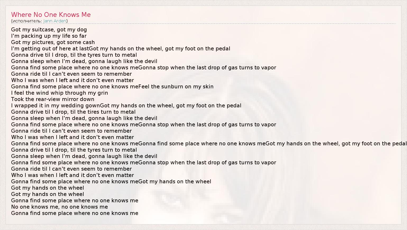 Got my suitcase, got my dog I'm packing up my life so far Got my pictures, got some cash I'm getting out of here at lastGot my hands on the wheel, got my foot on the pedal Gonna drive til I drop, til the tyres turn to metal Gonna sleep when I'm dead, gonna laugh like the devil Gonna find some place where no one knows meGonna stop when the last drop of gas turns to vapor Gonna ride til I can't even seem to remember Who I was when I left and it don't even matter Gonna find some place where no one knows meFeel the sunburn on my skin I feel the wind whip through my grin Took the rear-view mirror down I wrapped it in my wedding gownGot my hands on the wheel, got my foot on the pedal Gonna drive til I drop, til the tires turn to metal Gonna sleep when I'm dead, gonna laugh like the devil Gonna find some place where no one knows meGonna stop when the last drop of gas turns to vapor Gonna ride til I can't even seem to remember Who I was when I left and it don't even matter Gonna find some place where no one knows meGonna find some place where no one knows meGot my hands on the wheel, got my foot on the pedal Gonna drive til I drop, til the tyres turn to metal Gonna sleep when I'm dead, gonna laugh like the devil Gonna find some place where no one knows meGonna stop when the last drop of gas turns to vapor Gonna ride til I can't even seem to remember Who I was when I left and it don't even matter Gonna find some place where no one knows meGot my hands on the wheel Got my hands on the wheel Got my hands on the wheel Gonna find some place where no one knows me No one knows me, no one knows me Gonna find some place where no one knows me