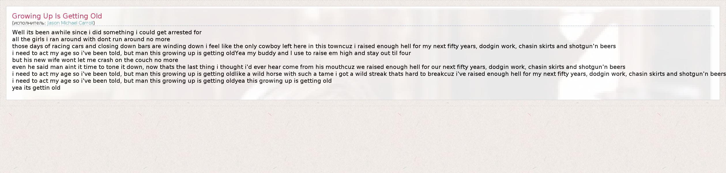 Well its been awhile since i did something i could get arrested for all the girls i ran around with dont run around no more those days of racing cars and closing down bars are winding down i feel like the only cowboy left here in this towncuz i raised enough hell for my next fifty years, dodgin work, chasin skirts and shotgun'n beers i need to act my age so i've been told, but man this growing up is getting oldYea my buddy and I use to raise em high and stay out til four but his new wife wont let me crash on the couch no more even he said man aint it time to tone it down, now thats the last thing i thought i'd ever hear come from his mouthcuz we raised enough hell for our next fifty years, dodgin work, chasin skirts and shotgun'n beers i need to act my age so i've been told, but man this growing up is getting oldlike a wild horse with such a tame i got a wild streak thats hard to breakcuz i've raised enough hell for my next fifty years, dodgin work, chasin skirts and shotgun'n beers i need to act my age so i've been told, but man this growing up is getting oldyea this growing up is getting old yea its gettin old