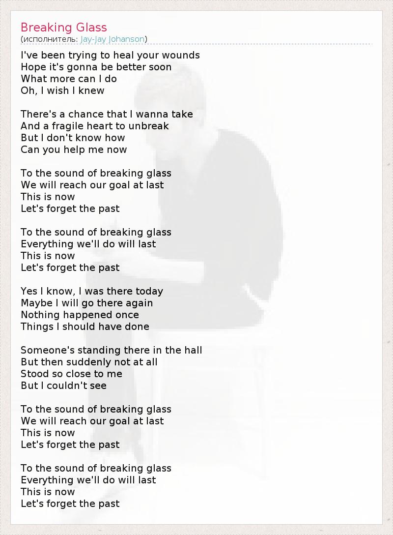 I've been trying to heal your wounds Hope it's gonna be better soon What more can I do Oh, I wish I knew There's a chance that I wanna take And a fragile heart to unbreak But I don't know how Can you help me now To the sound of breaking glass We will reach our goal at last This is now Let's forget the past To the sound of breaking glass Everything we'll do will last This is now Let's forget the past Yes I know, I was there today Maybe I will go there again Nothing happened once Things I should have done Someone's standing there in the hall But then suddenly not at all Stood so close to me But I couldn't see To the sound of breaking glass We will reach our goal at last This is now Let's forget the past To the sound of breaking glass Everything we'll do will last This is now Let's forget the past