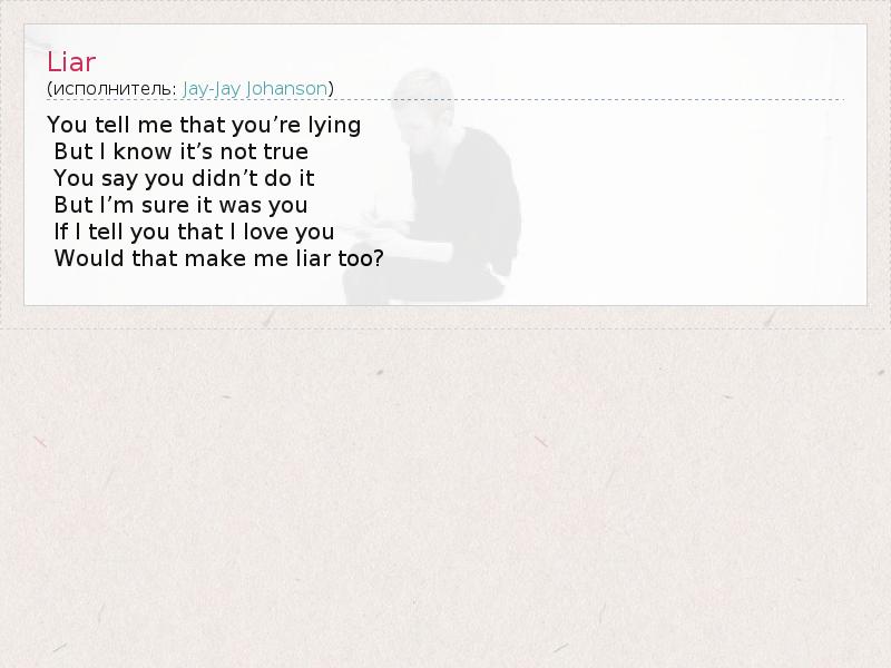 You tell me that you’re lying But I know it’s not true You say you didn’t do it But I’m sure it was you If I tell you that I love you Would that make me liar too?