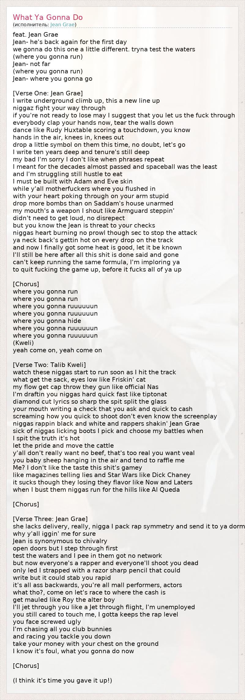 feat. Jean Grae Jean- he's back again for the first day we gonna do this one a little different. tryna test the waters (where you gonna run) Jean- not far (where you gonna run) Jean- where you gonna go [Verse One: Jean Grae] I write underground climb up, this a new line up niggaz fight your way through if you're not ready to lose may I suggest that you let us the fuck through everybody clap your hands now, tear the walls down dance like Rudy Huxtable scoring a touchdown, you know hands in the air, knees in, knees out drop a little symbol on them this time, no doubt, let's go I write ten years deep and tenure's still deep my bad I'm sorry I don't like when phrases repeat I meant for the decades almost passed and spaceball was the least and I'm struggling still hustle to eat I must be built with Adam and Eve skin while y'all motherfuckers where you flushed in with your heart poking through on your arm stupid drop more bombs than on Saddam's house unarmed my mouth's a weapon I shout like Armguard steppin' didn't need to get loud, no disrepect but you know the Jean is threat to your checks niggas heart burning no prowl though sec to stop the attack ya neck back's gettin hot on every drop on the track and now I finally got some heat is good, let it be known I'll still be here after all this shit is done said and gone can't keep running the same formula, I'm imploring ya to quit fucking the game up, before it fucks all of ya up [Chorus] where you gonna run where you gonna run where you gonna ruuuuuun where you gonna ruuuuuun where you gonna hide where you gonna ruuuuuun where you gonna ruuuuuun (Kweli) yeah come on, yeah come on [Verse Two: Talib Kweli] watch these niggas start to run soon as I hit the track what get the sack, eyes low like Friskin' cat my flow get cap throw they gun like official Nas I'm draftin you niggas hard quick fast like tiptonat diamond cut lyrics so sharp the spit split the glass your mouth writing a check that you ask and quick to cash screaming how you quick to shoot don't even know the screenplay niggas rappin black and white and rappers shakin' Jean Grae sick of niggas licking boots I pick and choose my battles when I spit the truth it's hot let the pride and move the cattle y'all don't really want no beef, that's too real you want veal you baby sheep hanging in the air and tend to raffle me Me? I don't like the taste this shit's gamey like magazines telling lies and Star Wars like Dick Chaney it sucks though they losing they flavor like Now and Laters when I bust them niggas run for the hills like Al Queda [Chorus] [Verse Three: Jean Grae] she lacks delivery, really, nigga I pack rap symmetry and send it to ya dorm why y'all iggin' me for sure Jean is synonymous to chivalry open doors but I step through first test the waters and I pee in them got no network but now everyone's a rapper and everyone'll shoot you dead only led I strapped with a razor sharp pencil that could write but it could stab you rapid it's all ass backwards, you're all mall performers, actors what tho?, come on let's race to where the cash is get mauled like Roy the alter boy I'll jet through you like a Jet through flight, I'm unemployed you still cared to touch me, I gotta keeps the rap level you face screwed ugly I'm chasing all you club bunnies and racing you tackle you down take your money with your chest on the ground I know it's foul, what you gonna do now [Chorus] (I think it's time you gave it up!)