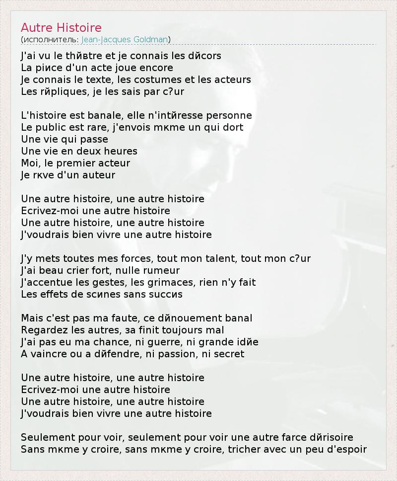 Это интересно:ИсторияПевец и композитор Жан-Жак Гольдман (Jean-Jacques Goldman) практически не известен за пределами франкоязычных стран. В то же время во Франции он является одним из самых любимых авторов и исполнителей, неоднократно возглавлявший хит-парад любимцев французских женщин. Его песни чаще всего крутит французское радио, однако, по его собственному признанию, любимое его занятие — писать для... продолжение