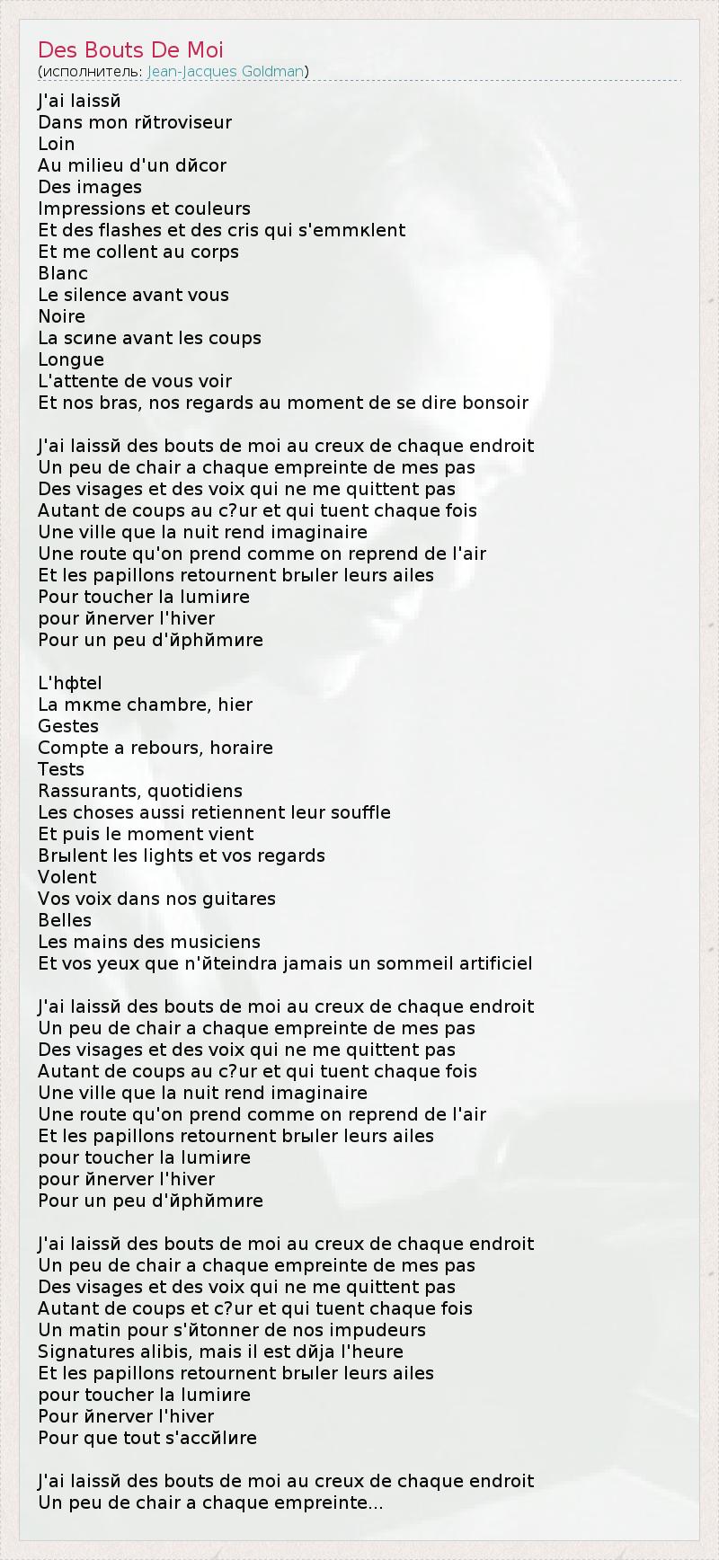 А как ты думаешь, о чем песня "Des Bouts De Moi" ?