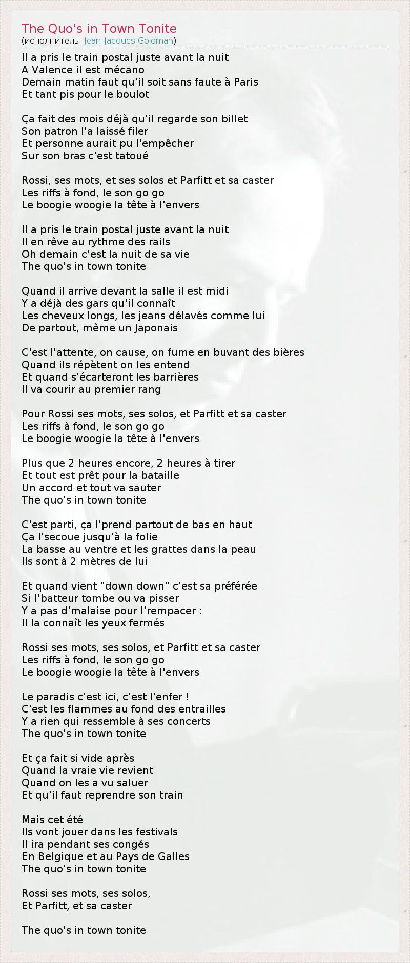 А как ты думаешь, о чем песня "The Quo's in Town Tonite" ?