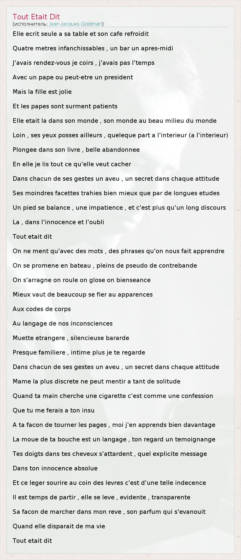 Elle ecrit seule a sa table et son cafe refroidit Quatre metres infanchissables , un bar un apres-midi J'avais rendez-vous je coirs , j'avais pas l'temps Avec un pape ou peut-etre un president Mais la fille est jolie Et les papes sont surment patients Elle etait la dans son monde , son monde au beau milieu du monde Loin , ses yeux posses ailleurs , queleque part a l'interieur (a l'interieur) Plongee dans son livre , belle abandonnee En elle je lis tout ce qu'elle veut cacher Dans chacun de ses gestes un aveu , un secret dans chaque attitude Ses moindres facettes trahies bien mieux que par de longues etudes Un pied se balance , une impatience , et c'est plus qu'un long discours La , dans l'innocence et l'oubli Tout etait dit On ne ment qu'avec des mots , des phrases qu'on nous fait apprendre On se promene en bateau , pleins de pseudo de contrebande On s'arragne on roule on glose on bienseance Mieux vaut de beaucoup se fier au apparences Aux codes de corps Au langage de nos inconsciences Muette etrangere , silencieuse bararde Presque familiere , intime plus je te regarde Dans chacun de ses gestes un aveu , un secret dans chaque attitude Mame la plus discrete ne peut mentir a tant de solitude Quand ta main cherche une cigarette c'est comme une confession Que tu me ferais a ton insu A ta facon de tourner les pages , moi j'en apprends bien davantage La moue de ta bouche est un langage , ton regard un temoignange Tes doigts dans tes cheveux s'attardent , quel explicite message Dans ton innocence absolue Et ce leger sourire au coin des levres c'est d'une telle indecence Il est temps de partir , elle se leve , evidente , transparente Sa facon de marcher dans mon reve , son parfum qui s'evanouit Quand elle disparait de ma vie Tout etait dit