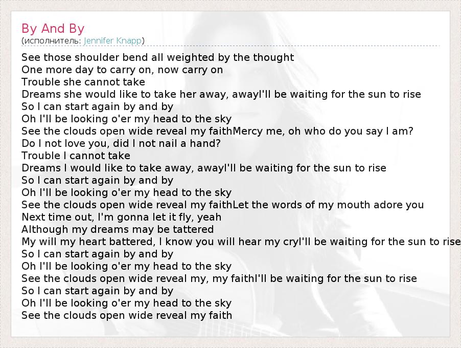 See those shoulder bend all weighted by the thought One more day to carry on, now carry on Trouble she cannot take Dreams she would like to take her away, awayI'll be waiting for the sun to rise So I can start again by and by Oh I'll be looking o'er my head to the sky See the clouds open wide reveal my faithMercy me, oh who do you say I am? Do I not love you, did I not nail a hand? Trouble I cannot take Dreams I would like to take away, awayI'll be waiting for the sun to rise So I can start again by and by Oh I'll be looking o'er my head to the sky See the clouds open wide reveal my faithLet the words of my mouth adore you Next time out, I'm gonna let it fly, yeah Although my dreams may be tattered My will my heart battered, I know you will hear my cryI'll be waiting for the sun to rise So I can start again by and by Oh I'll be looking o'er my head to the sky See the clouds open wide reveal my, my faithI'll be waiting for the sun to rise So I can start again by and by Oh I'll be looking o'er my head to the sky See the clouds open wide reveal my faith