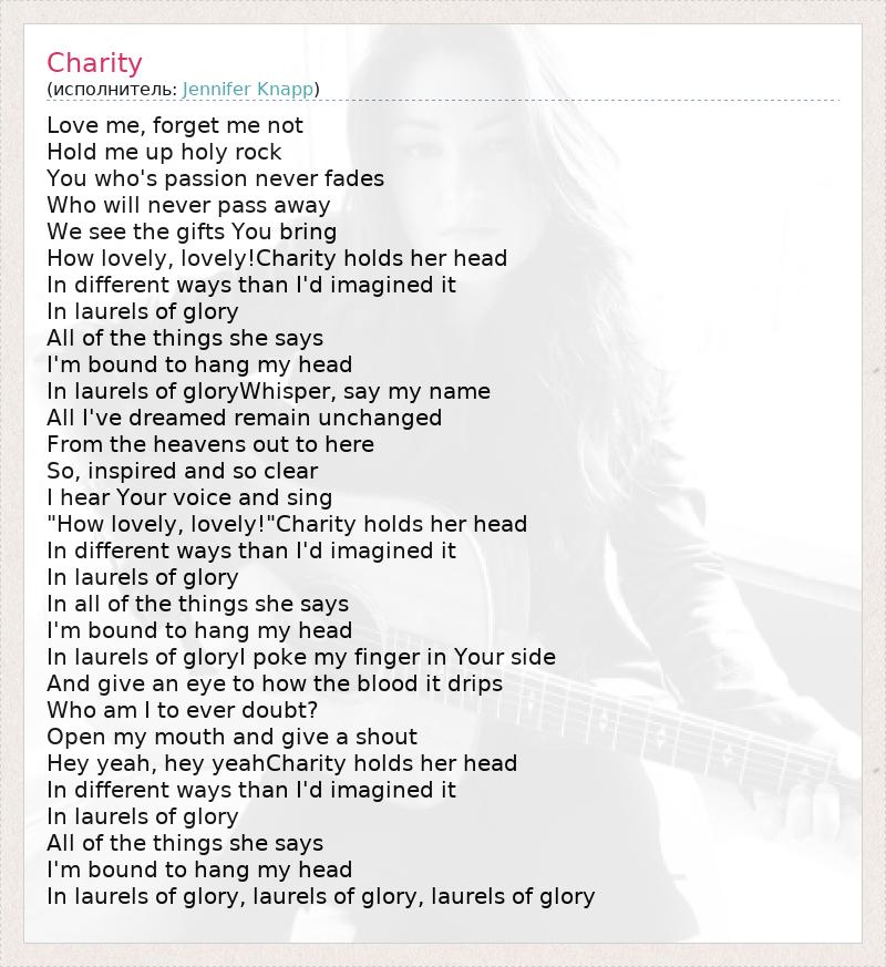 Love me, forget me not Hold me up holy rock You who's passion never fades Who will never pass away We see the gifts You bring How lovely, lovely!Charity holds her head In different ways than I'd imagined it In laurels of glory All of the things she says I'm bound to hang my head In laurels of gloryWhisper, say my name All I've dreamed remain unchanged From the heavens out to here So, inspired and so clear I hear Your voice and sing "How lovely, lovely!"Charity holds her head In different ways than I'd imagined it In laurels of glory In all of the things she says I'm bound to hang my head In laurels of gloryI poke my finger in Your side And give an eye to how the blood it drips Who am I to ever doubt? Open my mouth and give a shout Hey yeah, hey yeahCharity holds her head In different ways than I'd imagined it In laurels of glory All of the things she says I'm bound to hang my head In laurels of glory, laurels of glory, laurels of glory