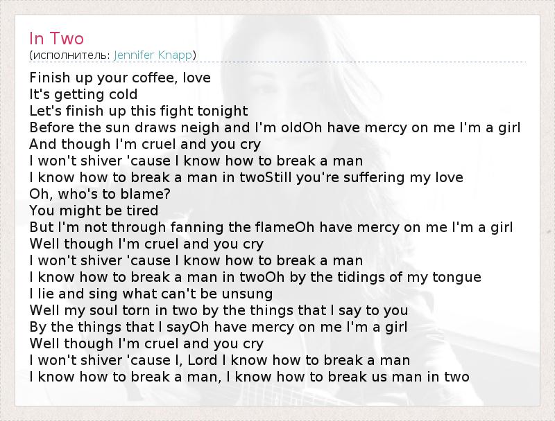 Finish up your coffee, love It's getting cold Let's finish up this fight tonight Before the sun draws neigh and I'm oldOh have mercy on me I'm a girl And though I'm cruel and you cry I won't shiver 'cause I know how to break a man I know how to break a man in twoStill you're suffering my love Oh, who's to blame? You might be tired But I'm not through fanning the flameOh have mercy on me I'm a girl Well though I'm cruel and you cry I won't shiver 'cause I know how to break a man I know how to break a man in twoOh by the tidings of my tongue I lie and sing what can't be unsung Well my soul torn in two by the things that I say to you By the things that I sayOh have mercy on me I'm a girl Well though I'm cruel and you cry I won't shiver 'cause I, Lord I know how to break a man I know how to break a man, I know how to break us man in two