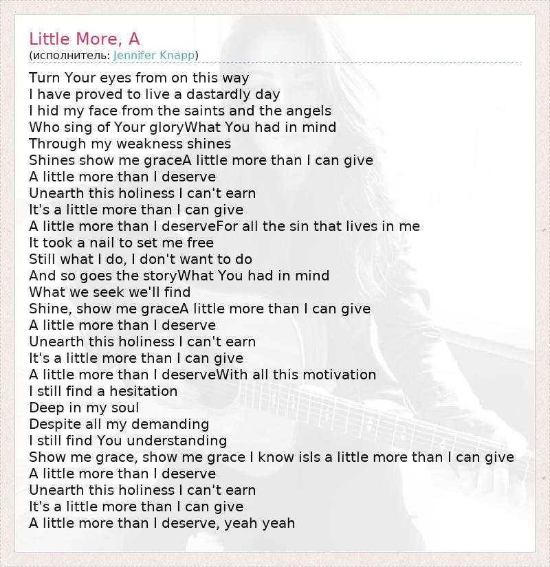 Turn Your eyes from on this way I have proved to live a dastardly day I hid my face from the saints and the angels Who sing of Your gloryWhat You had in mind Through my weakness shines Shines show me graceA little more than I can give A little more than I deserve Unearth this holiness I can't earn It's a little more than I can give A little more than I deserveFor all the sin that lives in me It took a nail to set me free Still what I do, I don't want to do And so goes the storyWhat You had in mind What we seek we'll find Shine, show me graceA little more than I can give A little more than I deserve Unearth this holiness I can't earn It's a little more than I can give A little more than I deserveWith all this motivation I still find a hesitation Deep in my soul Despite all my demanding I still find You understanding Show me grace, show me grace I know isIs a little more than I can give A little more than I deserve Unearth this holiness I can't earn It's a little more than I can give A little more than I deserve, yeah yeah