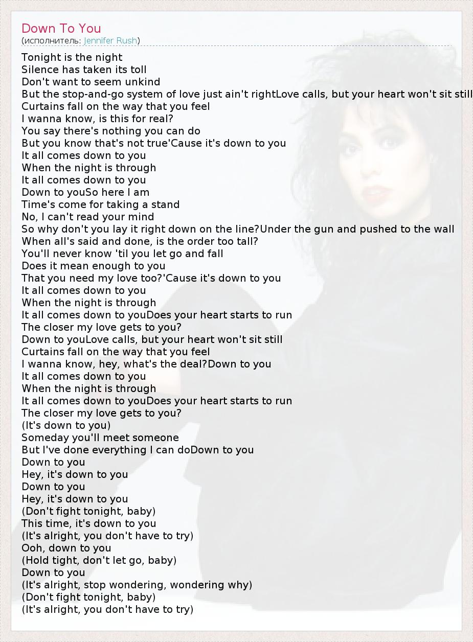 Tonight is the night Silence has taken its toll Don't want to seem unkind But the stop-and-go system of love just ain't rightLove calls, but your heart won't sit still Curtains fall on the way that you feel I wanna know, is this for real? You say there's nothing you can do But you know that's not true'Cause it's down to you It all comes down to you When the night is through It all comes down to you Down to youSo here I am Time's come for taking a stand No, I can't read your mind So why don't you lay it right down on the line?Under the gun and pushed to the wall When all's said and done, is the order too tall? You'll never know 'til you let go and fall Does it mean enough to you That you need my love too?'Cause it's down to you It all comes down to you When the night is through It all comes down to youDoes your heart starts to run The closer my love gets to you? Down to youLove calls, but your heart won't sit still Curtains fall on the way that you feel I wanna know, hey, what's the deal?Down to you It all comes down to you When the night is through It all comes down to youDoes your heart starts to run The closer my love gets to you? (It's down to you) Someday you'll meet someone But I've done everything I can doDown to you Down to you Hey, it's down to you Down to you Hey, it's down to you (Don't fight tonight, baby) This time, it's down to you (It's alright, you don't have to try) Ooh, down to you (Hold tight, don't let go, baby) Down to you (It's alright, stop wondering, wondering why) (Don't fight tonight, baby) (It's alright, you don't have to try)