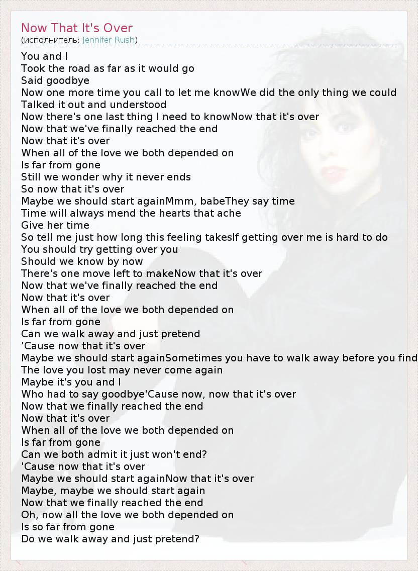 You and I Took the road as far as it would go Said goodbye Now one more time you call to let me knowWe did the only thing we could Talked it out and understood Now there's one last thing I need to knowNow that it's over Now that we've finally reached the end Now that it's over When all of the love we both depended on Is far from gone Still we wonder why it never ends So now that it's over Maybe we should start againMmm, babeThey say time Time will always mend the hearts that ache Give her time So tell me just how long this feeling takesIf getting over me is hard to do You should try getting over you Should we know by now There's one move left to makeNow that it's over Now that we've finally reached the end Now that it's over When all of the love we both depended on Is far from gone Can we walk away and just pretend 'Cause now that it's over Maybe we should start againSometimes you have to walk away before you find The love you lost may never come again Maybe it's you and I Who had to say goodbye'Cause now, now that it's over Now that we finally reached the end Now that it's over When all of the love we both depended on Is far from gone Can we both admit it just won't end? 'Cause now that it's over Maybe we should start againNow that it's over Maybe, maybe we should start again Now that we finally reached the end Oh, now all the love we both depended on Is so far from gone Do we walk away and just pretend?