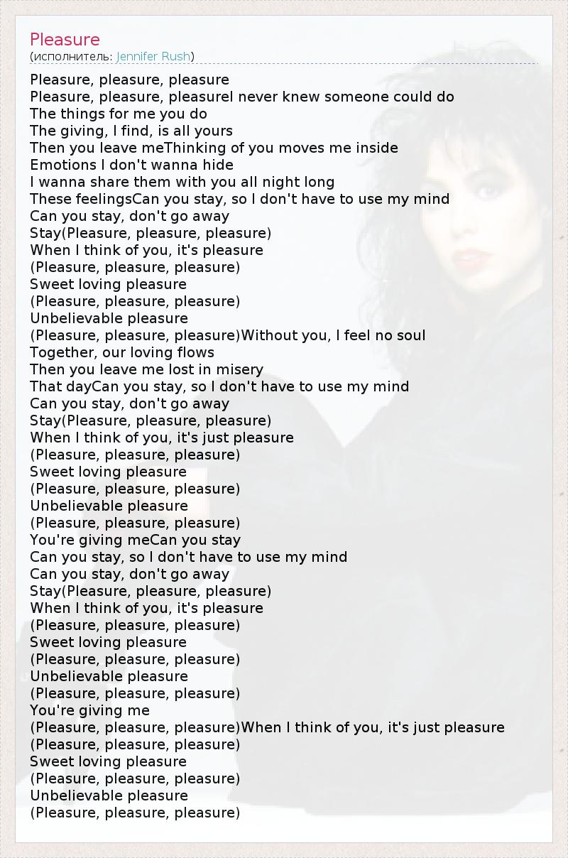 Pleasure, pleasure, pleasure Pleasure, pleasure, pleasureI never knew someone could do The things for me you do The giving, I find, is all yours Then you leave meThinking of you moves me inside Emotions I don't wanna hide I wanna share them with you all night long These feelingsCan you stay, so I don't have to use my mind Can you stay, don't go away Stay(Pleasure, pleasure, pleasure) When I think of you, it's pleasure (Pleasure, pleasure, pleasure) Sweet loving pleasure (Pleasure, pleasure, pleasure) Unbelievable pleasure (Pleasure, pleasure, pleasure)Without you, I feel no soul Together, our loving flows Then you leave me lost in misery That dayCan you stay, so I don't have to use my mind Can you stay, don't go away Stay(Pleasure, pleasure, pleasure) When I think of you, it's just pleasure (Pleasure, pleasure, pleasure) Sweet loving pleasure (Pleasure, pleasure, pleasure) Unbelievable pleasure (Pleasure, pleasure, pleasure) You're giving meCan you stay Can you stay, so I don't have to use my mind Can you stay, don't go away Stay(Pleasure, pleasure, pleasure) When I think of you, it's pleasure (Pleasure, pleasure, pleasure) Sweet loving pleasure (Pleasure, pleasure, pleasure) Unbelievable pleasure (Pleasure, pleasure, pleasure) You're giving me (Pleasure, pleasure, pleasure)When I think of you, it's just pleasure (Pleasure, pleasure, pleasure) Sweet loving pleasure (Pleasure, pleasure, pleasure) Unbelievable pleasure (Pleasure, pleasure, pleasure)