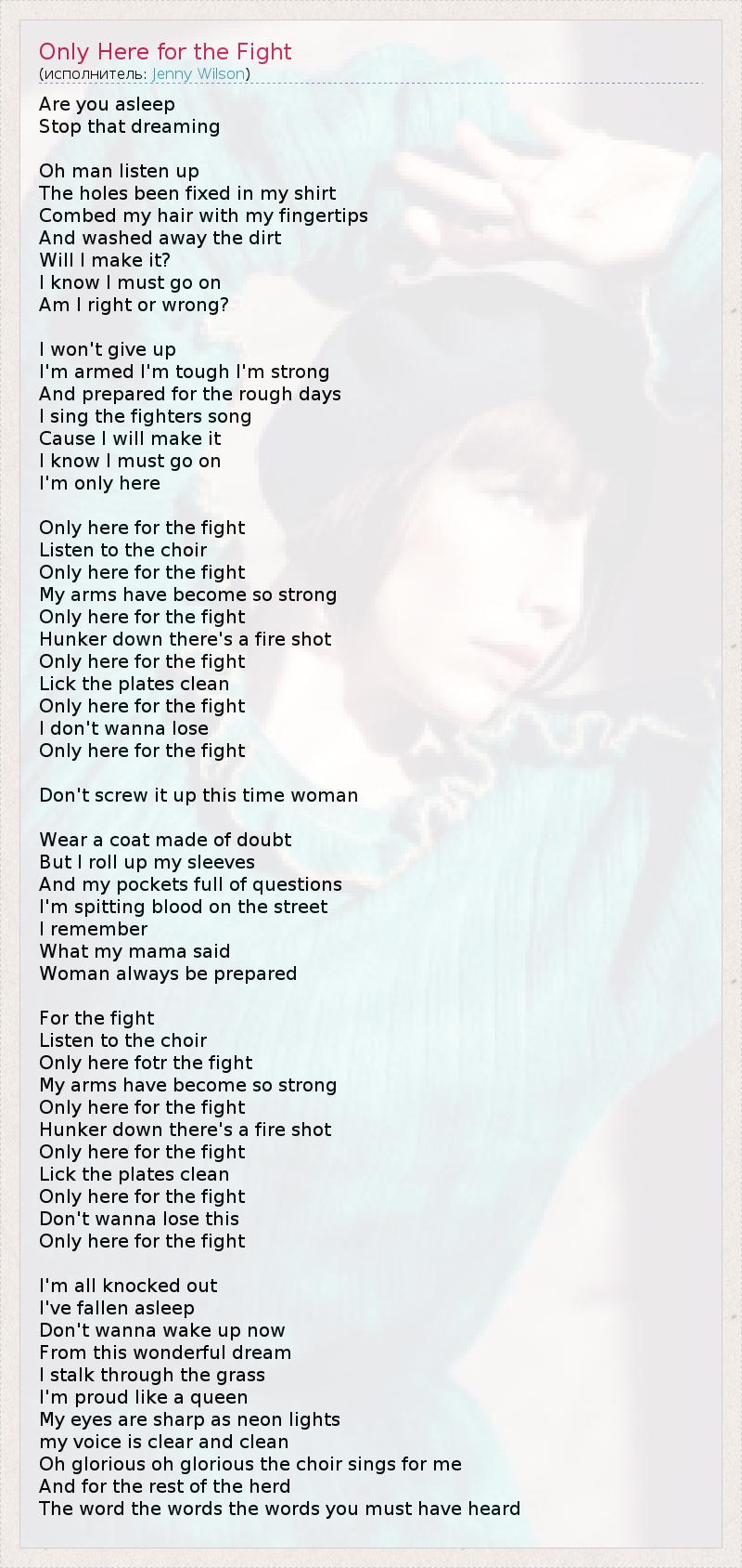 Are you asleep Stop that dreaming Oh man listen up The holes been fixed in my shirt Combed my hair with my fingertips And washed away the dirt Will I make it? I know I must go on Am I right or wrong? I won't give up I'm armed I'm tough I'm strong And prepared for the rough days I sing the fighters song Cause I will make it I know I must go on I'm only here Only here for the fight Listen to the choir Only here for the fight My arms have become so strong Only here for the fight Hunker down there's a fire shot Only here for the fight Lick the plates clean Only here for the fight I don't wanna lose Only here for the fight Don't screw it up this time woman Wear a coat made of doubt But I roll up my sleeves And my pockets full of questions I'm spitting blood on the street I remember What my mama said Woman always be prepared For the fight Listen to the choir Only here fotr the fight My arms have become so strong Only here for the fight Hunker down there's a fire shot Only here for the fight Lick the plates clean Only here for the fight Don't wanna lose this Only here for the fight I'm all knocked out I've fallen asleep Don't wanna wake up now From this wonderful dream I stalk through the grass I'm proud like a queen My eyes are sharp as neon lights my voice is clear and clean Oh glorious oh glorious the choir sings for me And for the rest of the herd The word the words the words you must have heard