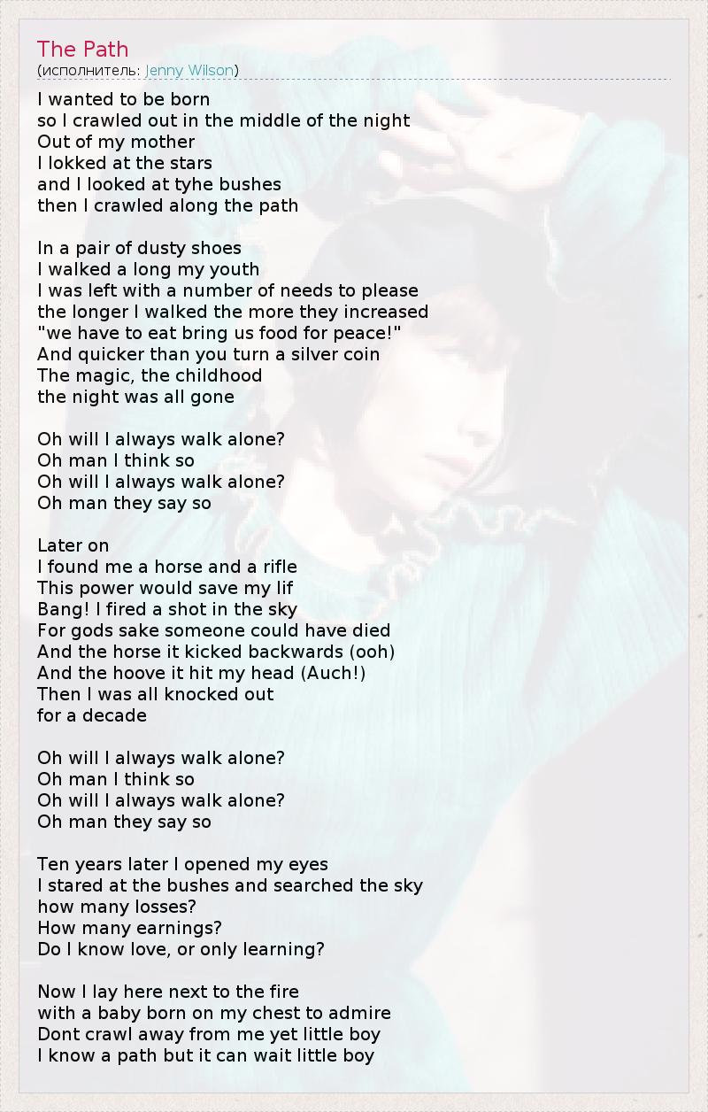 I wanted to be born so I crawled out in the middle of the night Out of my mother I lokked at the stars and I looked at tyhe bushes then I crawled along the path In a pair of dusty shoes I walked a long my youth I was left with a number of needs to please the longer I walked the more they increased "we have to eat bring us food for peace!" And quicker than you turn a silver coin The magic, the childhood the night was all gone Oh will I always walk alone? Oh man I think so Oh will I always walk alone? Oh man they say so Later on I found me a horse and a rifle This power would save my lif Bang! I fired a shot in the sky For gods sake someone could have died And the horse it kicked backwards (ooh) And the hoove it hit my head (Auch!) Then I was all knocked out for a decade Oh will I always walk alone? Oh man I think so Oh will I always walk alone? Oh man they say so Ten years later I opened my eyes I stared at the bushes and searched the sky how many losses? How many earnings? Do I know love, or only learning? Now I lay here next to the fire with a baby born on my chest to admire Dont crawl away from me yet little boy I know a path but it can wait little boy