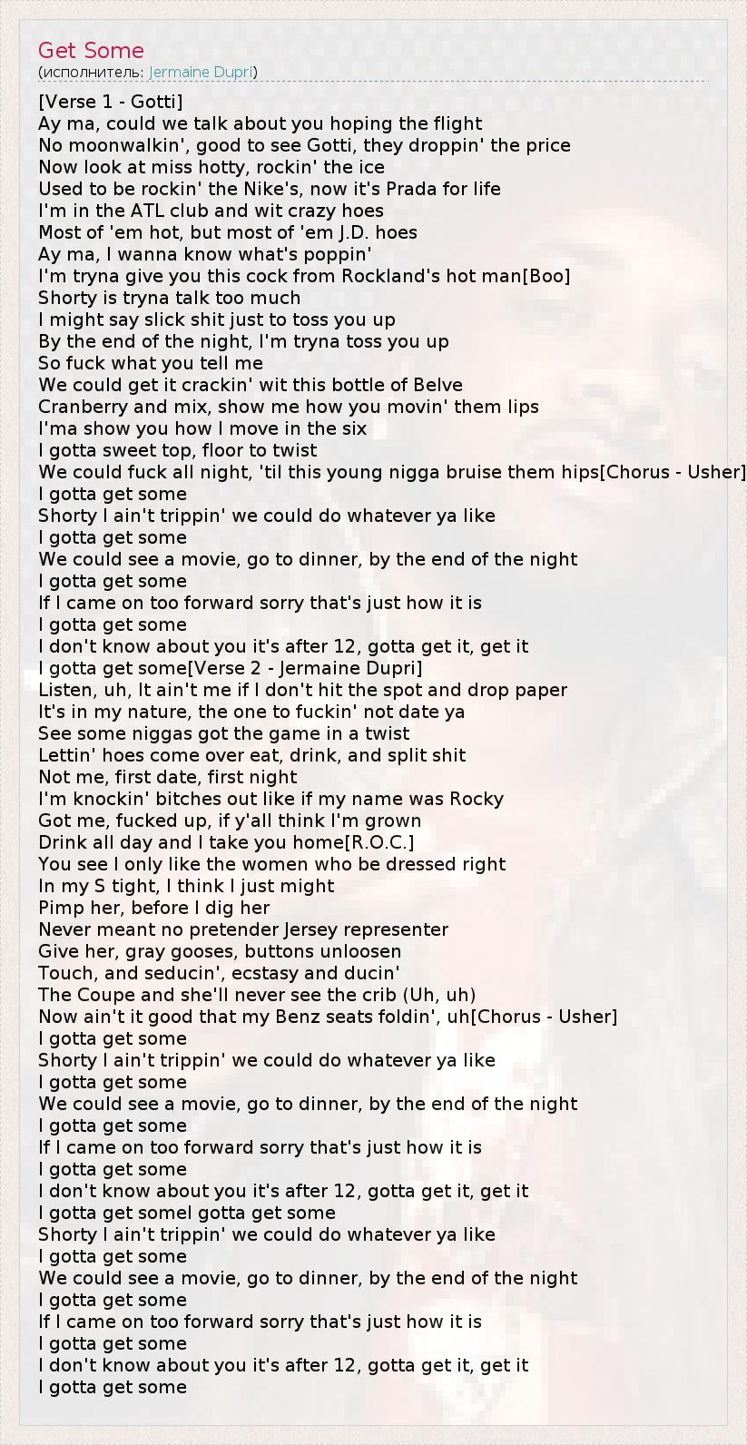 [Verse 1 - Gotti] Ay ma, could we talk about you hoping the flight No moonwalkin', good to see Gotti, they droppin' the price Now look at miss hotty, rockin' the ice Used to be rockin' the Nike's, now it's Prada for life I'm in the ATL club and wit crazy hoes Most of 'em hot, but most of 'em J.D. hoes Ay ma, I wanna know what's poppin' I'm tryna give you this cock from Rockland's hot man[Boo] Shorty is tryna talk too much I might say slick shit just to toss you up By the end of the night, I'm tryna toss you up So fuck what you tell me We could get it crackin' wit this bottle of Belve Cranberry and mix, show me how you movin' them lips I'ma show you how I move in the six I gotta sweet top, floor to twist We could fuck all night, 'til this young nigga bruise them hips[Chorus - Usher] I gotta get some Shorty I ain't trippin' we could do whatever ya like I gotta get some We could see a movie, go to dinner, by the end of the night I gotta get some If I came on too forward sorry that's just how it is I gotta get some I don't know about you it's after 12, gotta get it, get it I gotta get some[Verse 2 - Jermaine Dupri] Listen, uh, It ain't me if I don't hit the spot and drop paper It's in my nature, the one to fuckin' not date ya See some niggas got the game in a twist Lettin' hoes come over eat, drink, and split shit Not me, first date, first night I'm knockin' bitches out like if my name was Rocky Got me, fucked up, if y'all think I'm grown Drink all day and I take you home[R.O.C.] You see I only like the women who be dressed right In my S tight, I think I just might Pimp her, before I dig her Never meant no pretender Jersey representer Give her, gray gooses, buttons unloosen Touch, and seducin', ecstasy and ducin' The Coupe and she'll never see the crib (Uh, uh) Now ain't it good that my Benz seats foldin', uh[Chorus - Usher] I gotta get some Shorty I ain't trippin' we could do whatever ya like I gotta get some We could see a movie, go to dinner, by the end of the night I gotta get some If I came on too forward sorry that's just how it is I gotta get some I don't know about you it's after 12, gotta get it, get it I gotta get someI gotta get some Shorty I ain't trippin' we could do whatever ya like I gotta get some We could see a movie, go to dinner, by the end of the night I gotta get some If I came on too forward sorry that's just how it is I gotta get some I don't know about you it's after 12, gotta get it, get it I gotta get some