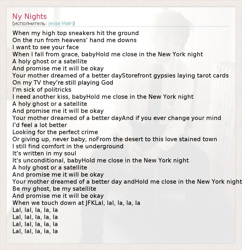 When my high top sneakers hit the ground On the run from heavens' hand me downs I want to see your face When I fall from grace, babyHold me close in the New York night A holy ghost or a satellite And promise me it will be okay Your mother dreamed of a better dayStorefront gypsies laying tarot cards On my TV they're still playing God I'm sick of politricks I need another kiss, babyHold me close in the New York night A holy ghost or a satellite And promise me it will be okay Your mother dreamed of a better dayAnd if you ever change your mind I'd feel a lot better Looking for the perfect crime Or giving up, never baby, noFrom the desert to this love stained town I still find comfort in the underground It's written in my soul It's unconditional, babyHold me close in the New York night A holy ghost or a satellite And promise me it will be okay Your mother dreamed of a better day andHold me close in the New York night Be my ghost, be my satellite And promise me it will be okay When we touch down at JFKLal, lal, la, la, la Lal, lal, la, la, la Lal, lal, la, la, la Lal, lal, la, la, la Lal, lal, la, la, la