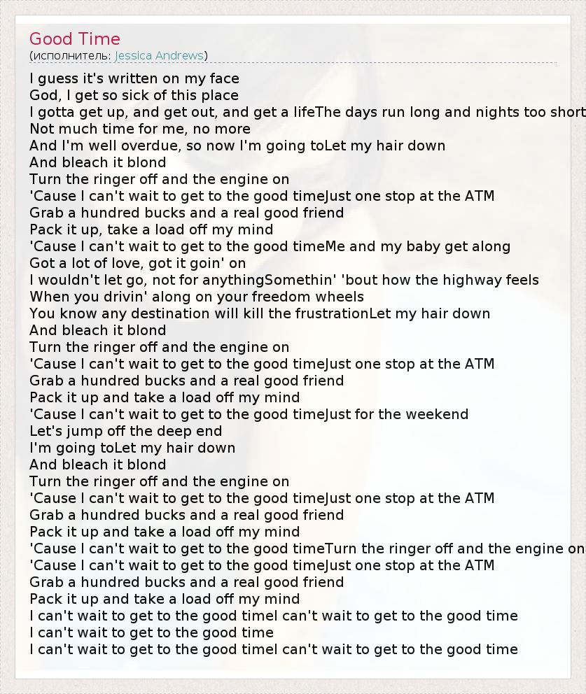 I guess it's written on my face God, I get so sick of this place I gotta get up, and get out, and get a lifeThe days run long and nights too short Not much time for me, no more And I'm well overdue, so now I'm going toLet my hair down And bleach it blond Turn the ringer off and the engine on 'Cause I can't wait to get to the good timeJust one stop at the ATM Grab a hundred bucks and a real good friend Pack it up, take a load off my mind 'Cause I can't wait to get to the good timeMe and my baby get along Got a lot of love, got it goin' on I wouldn't let go, not for anythingSomethin' 'bout how the highway feels When you drivin' along on your freedom wheels You know any destination will kill the frustrationLet my hair down And bleach it blond Turn the ringer off and the engine on 'Cause I can't wait to get to the good timeJust one stop at the ATM Grab a hundred bucks and a real good friend Pack it up and take a load off my mind 'Cause I can't wait to get to the good timeJust for the weekend Let's jump off the deep end I'm going toLet my hair down And bleach it blond Turn the ringer off and the engine on 'Cause I can't wait to get to the good timeJust one stop at the ATM Grab a hundred bucks and a real good friend Pack it up and take a load off my mind 'Cause I can't wait to get to the good timeTurn the ringer off and the engine on 'Cause I can't wait to get to the good timeJust one stop at the ATM Grab a hundred bucks and a real good friend Pack it up and take a load off my mind I can't wait to get to the good timeI can't wait to get to the good time I can't wait to get to the good time I can't wait to get to the good timeI can't wait to get to the good time