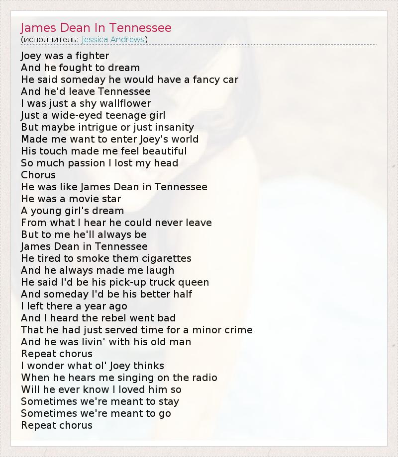Joey was a fighter And he fought to dream He said someday he would have a fancy car And he'd leave Tennessee I was just a shy wallflower Just a wide-eyed teenage girl But maybe intrigue or just insanity Made me want to enter Joey's world His touch made me feel beautiful So much passion I lost my head Chorus He was like James Dean in Tennessee He was a movie star A young girl's dream From what I hear he could never leave But to me he'll always be James Dean in Tennessee He tired to smoke them cigarettes And he always made me laugh He said I'd be his pick-up truck queen And someday I'd be his better half I left there a year ago And I heard the rebel went bad That he had just served time for a minor crime And he was livin' with his old man Repeat chorus I wonder what ol' Joey thinks When he hears me singing on the radio Will he ever know I loved him so Sometimes we're meant to stay Sometimes we're meant to go Repeat chorus