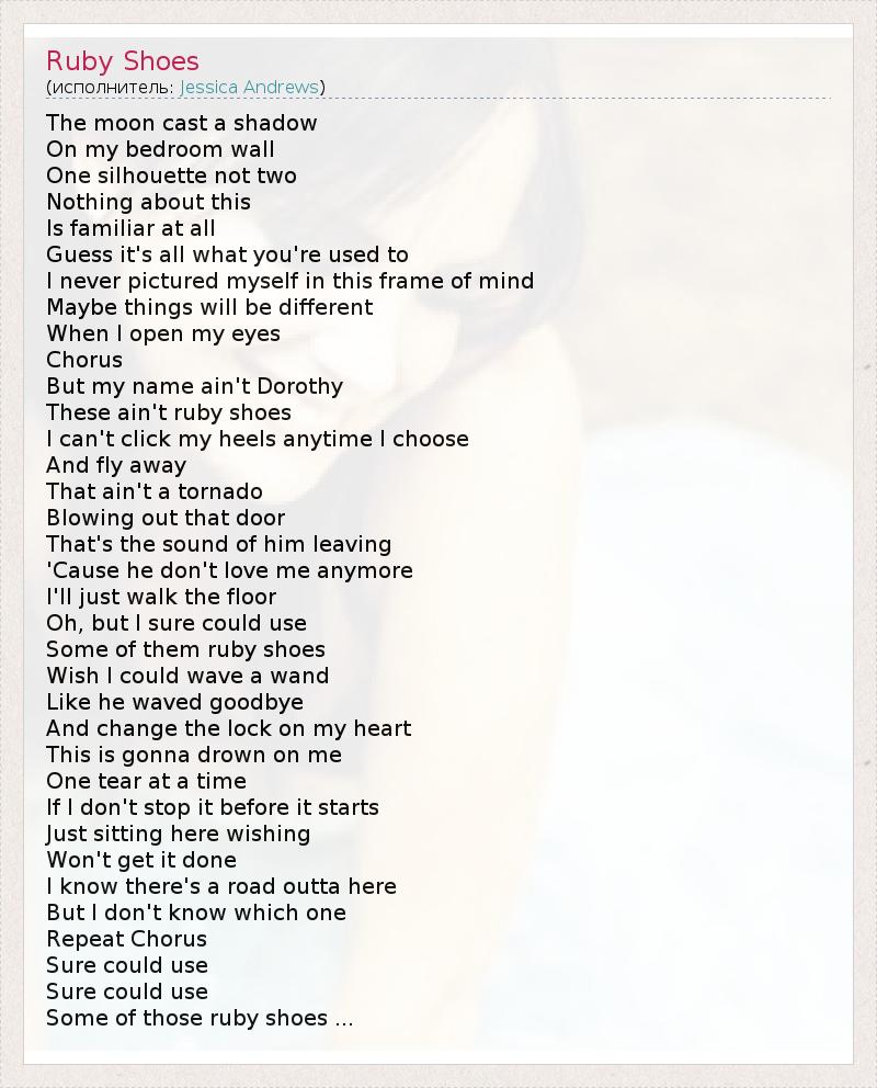 The moon cast a shadow On my bedroom wall One silhouette not two Nothing about this Is familiar at all Guess it's all what you're used to I never pictured myself in this frame of mind Maybe things will be different When I open my eyes Chorus But my name ain't Dorothy These ain't ruby shoes I can't click my heels anytime I choose And fly away That ain't a tornado Blowing out that door That's the sound of him leaving 'Cause he don't love me anymore I'll just walk the floor Oh, but I sure could use Some of them ruby shoes Wish I could wave a wand Like he waved goodbye And change the lock on my heart This is gonna drown on me One tear at a time If I don't stop it before it starts Just sitting here wishing Won't get it done I know there's a road outta here But I don't know which one Repeat Chorus Sure could use Sure could use Some of those ruby shoes ...