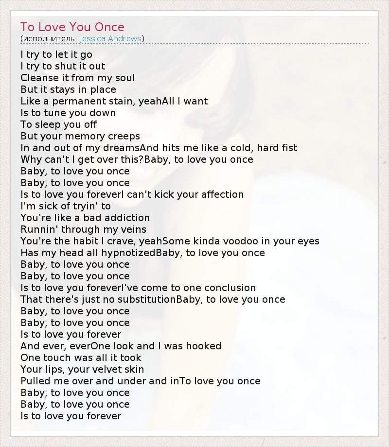 I try to let it go I try to shut it out Cleanse it from my soul But it stays in place Like a permanent stain, yeahAll I want Is to tune you down To sleep you off But your memory creeps In and out of my dreamsAnd hits me like a cold, hard fist Why can't I get over this?Baby, to love you once Baby, to love you once Baby, to love you once Is to love you foreverI can't kick your affection I'm sick of tryin' to You're like a bad addiction Runnin' through my veins You're the habit I crave, yeahSome kinda voodoo in your eyes Has my head all hypnotizedBaby, to love you once Baby, to love you once Baby, to love you once Is to love you foreverI've come to one conclusion That there's just no substitutionBaby, to love you once Baby, to love you once Baby, to love you once Is to love you forever And ever, everOne look and I was hooked One touch was all it took Your lips, your velvet skin Pulled me over and under and inTo love you once Baby, to love you once Baby, to love you once Is to love you forever