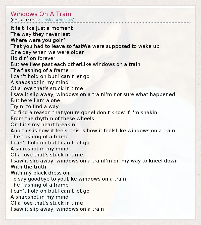 It felt like just a moment The way they never last Where were you goin' That you had to leave so fastWe were supposed to wake up One day when we were older Holdin' on forever But we flew past each otherLike windows on a train The flashing of a frame I can't hold on but I can't let go A snapshot in my mind Of a love that's stuck in time I saw it slip away, windows on a trainI'm not sure what happened But here I am alone Tryin' to find a way To find a reason that you're goneI don't know if I'm shakin' From the rhythm of these wheels Or if it's my heart breakin' And this is how it feels, this is how it feelsLike windows on a train The flashing of a frame I can't hold on but I can't let go A snapshot in my mind Of a love that's stuck in time I saw it slip away, windows on a trainI'm on my way to kneel down With the truth With my black dress on To say goodbye to youLike windows on a train The flashing of a frame I can't hold on but I can't let go A snapshot in my mind Of a love that's stuck in time I saw it slip away, windows on a train