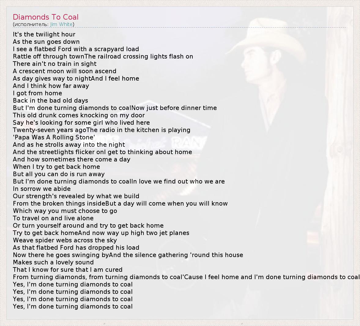 It's the twilight hour As the sun goes down I see a flatbed Ford with a scrapyard load Rattle off through townThe railroad crossing lights flash on There ain't no train in sight A crescent moon will soon ascend As day gives way to nightAnd I feel home And I think how far away I got from home Back in the bad old days But I'm done turning diamonds to coalNow just before dinner time This old drunk comes knocking on my door Say he's looking for some girl who lived here Twenty-seven years agoThe radio in the kitchen is playing 'Papa Was A Rolling Stone' And as he strolls away into the night And the streetlights flicker onI get to thinking about home And how sometimes there come a day When I try to get back home But all you can do is run away But I'm done turning diamonds to coalIn love we find out who we are In sorrow we abide Our strength's revealed by what we build From the broken things insideBut a day will come when you will know Which way you must choose to go To travel on and live alone Or turn yourself around and try to get back home Try to get back homeAnd now way up high two jet planes Weave spider webs across the sky As that flatbed Ford has dropped his load Now there he goes swinging byAnd the silence gathering 'round this house Makes such a lovely sound That I know for sure that I am cured From turning diamonds, from turning diamonds to coal'Cause I feel home and I'm done turning diamonds to coal Yes, I'm done turning diamonds to coal Yes, I'm done turning diamonds to coal Yes, I'm done turning diamonds to coal Yes, I'm done turning diamonds to coal