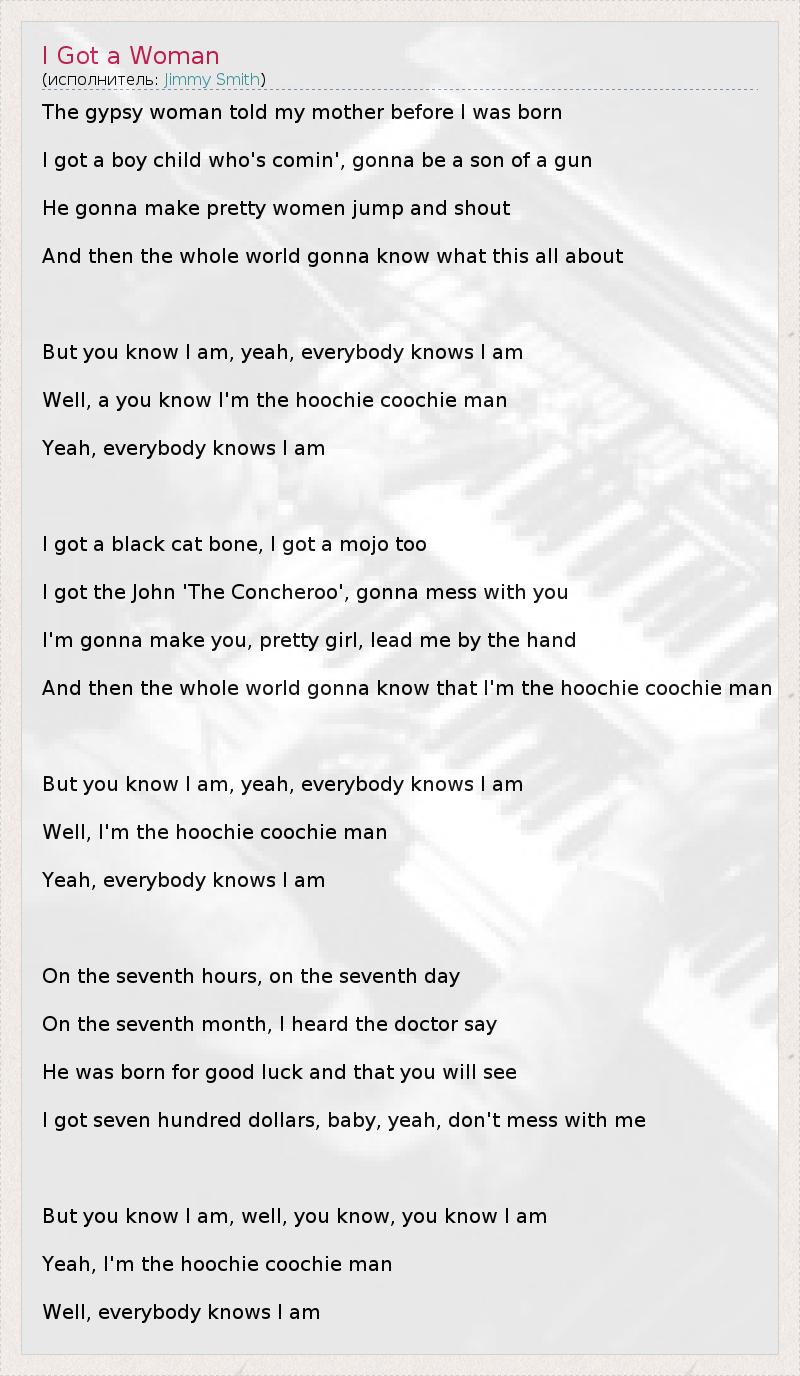 The gypsy woman told my mother before I was born I got a boy child who's comin', gonna be a son of a gun He gonna make pretty women jump and shout And then the whole world gonna know what this all about But you know I am, yeah, everybody knows I am Well, a you know I'm the hoochie coochie man Yeah, everybody knows I am I got a black cat bone, I got a mojo too I got the John 'The Concheroo', gonna mess with you I'm gonna make you, pretty girl, lead me by the hand And then the whole world gonna know that I'm the hoochie coochie man But you know I am, yeah, everybody knows I am Well, I'm the hoochie coochie man Yeah, everybody knows I am On the seventh hours, on the seventh day On the seventh month, I heard the doctor say He was born for good luck and that you will see I got seven hundred dollars, baby, yeah, don't mess with me But you know I am, well, you know, you know I am Yeah, I'm the hoochie coochie man Well, everybody knows I am