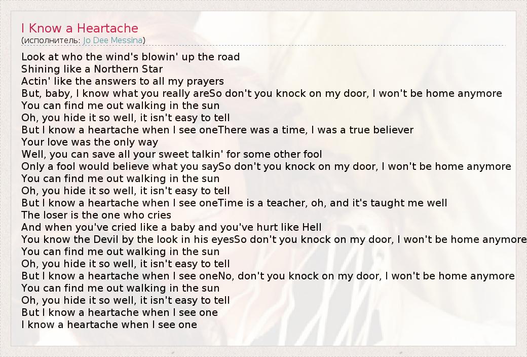 Look at who the wind's blowin' up the road Shining like a Northern Star Actin' like the answers to all my prayers But, baby, I know what you really areSo don't you knock on my door, I won't be home anymore You can find me out walking in the sun Oh, you hide it so well, it isn't easy to tell But I know a heartache when I see oneThere was a time, I was a true believer Your love was the only way Well, you can save all your sweet talkin' for some other fool Only a fool would believe what you saySo don't you knock on my door, I won't be home anymore You can find me out walking in the sun Oh, you hide it so well, it isn't easy to tell But I know a heartache when I see oneTime is a teacher, oh, and it's taught me well The loser is the one who cries And when you've cried like a baby and you've hurt like Hell You know the Devil by the look in his eyesSo don't you knock on my door, I won't be home anymore You can find me out walking in the sun Oh, you hide it so well, it isn't easy to tell But I know a heartache when I see oneNo, don't you knock on my door, I won't be home anymore You can find me out walking in the sun Oh, you hide it so well, it isn't easy to tell But I know a heartache when I see one I know a heartache when I see one