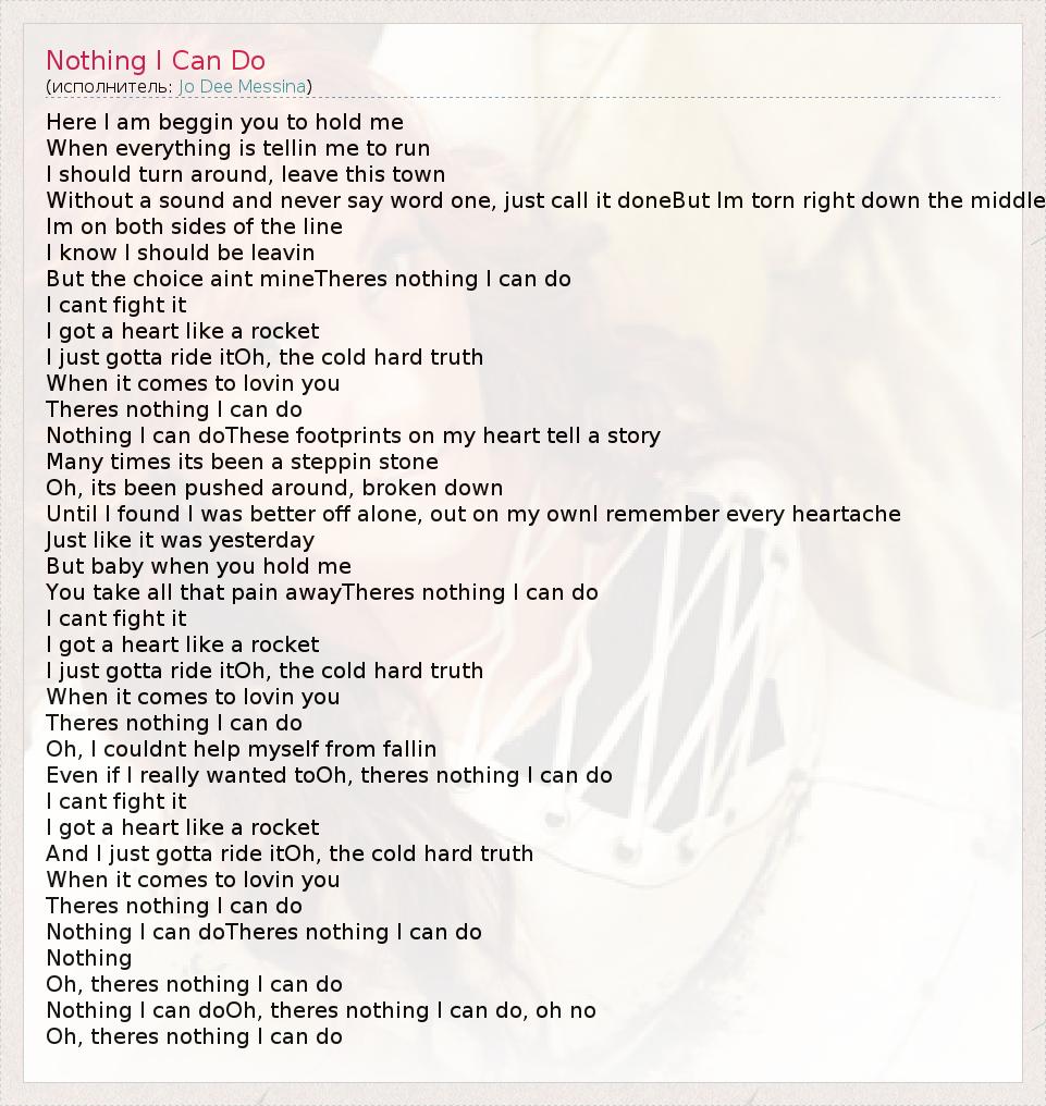 Here I am beggin you to hold me When everything is tellin me to run I should turn around, leave this town Without a sound and never say word one, just call it doneBut Im torn right down the middle Im on both sides of the line I know I should be leavin But the choice aint mineTheres nothing I can do I cant fight it I got a heart like a rocket I just gotta ride itOh, the cold hard truth When it comes to lovin you Theres nothing I can do Nothing I can doThese footprints on my heart tell a story Many times its been a steppin stone Oh, its been pushed around, broken down Until I found I was better off alone, out on my ownI remember every heartache Just like it was yesterday But baby when you hold me You take all that pain awayTheres nothing I can do I cant fight it I got a heart like a rocket I just gotta ride itOh, the cold hard truth When it comes to lovin you Theres nothing I can do Oh, I couldnt help myself from fallin Even if I really wanted toOh, theres nothing I can do I cant fight it I got a heart like a rocket And I just gotta ride itOh, the cold hard truth When it comes to lovin you Theres nothing I can do Nothing I can doTheres nothing I can do Nothing Oh, theres nothing I can do Nothing I can doOh, theres nothing I can do, oh no Oh, theres nothing I can do