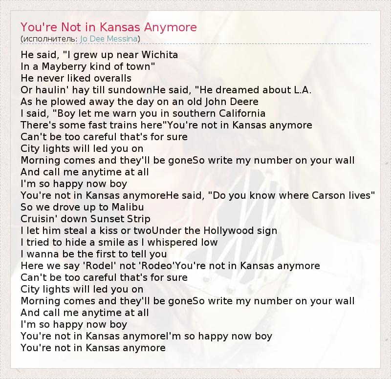 He said, "I grew up near Wichita In a Mayberry kind of town" He never liked overalls Or haulin' hay till sundownHe said, "He dreamed about L.A. As he plowed away the day on an old John Deere I said, "Boy let me warn you in southern California There's some fast trains here"You're not in Kansas anymore Can't be too careful that's for sure City lights will led you on Morning comes and they'll be goneSo write my number on your wall And call me anytime at all I'm so happy now boy You're not in Kansas anymoreHe said, "Do you know where Carson lives" So we drove up to Malibu Cruisin' down Sunset Strip I let him steal a kiss or twoUnder the Hollywood sign I tried to hide a smile as I whispered low I wanna be the first to tell you Here we say 'Rodel' not 'Rodeo'You're not in Kansas anymore Can't be too careful that's for sure City lights will led you on Morning comes and they'll be goneSo write my number on your wall And call me anytime at all I'm so happy now boy You're not in Kansas anymoreI'm so happy now boy You're not in Kansas anymore