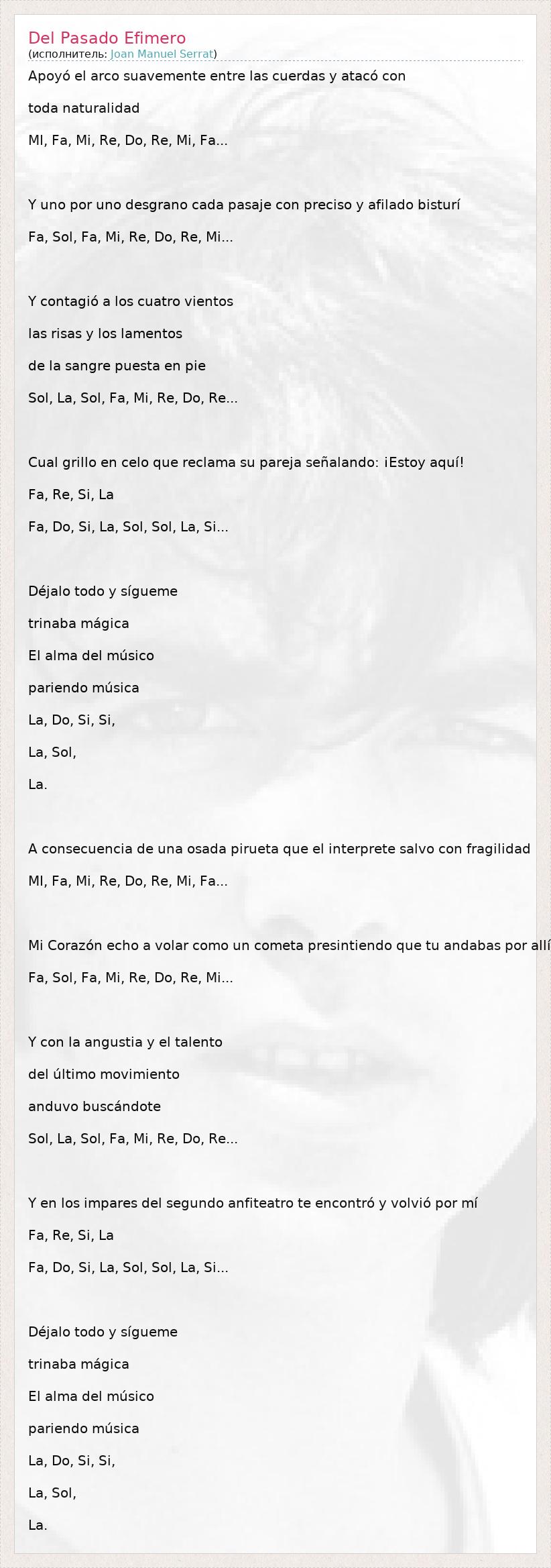 Apoyó el arco suavemente entre las cuerdas y atacó con toda naturalidad MI, Fa, Mi, Re, Do, Re, Mi, Fa... Y uno por uno desgrano cada pasaje con preciso y afilado bisturí Fa, Sol, Fa, Mi, Re, Do, Re, Mi... Y contagió a los cuatro vientos las risas y los lamentos de la sangre puesta en pie Sol, La, Sol, Fa, Mi, Re, Do, Re... Cual grillo en celo que reclama su pareja señalando: ¡Estoy aquí! Fa, Re, Si, La Fa, Do, Si, La, Sol, Sol, La, Si... Déjalo todo y sígueme trinaba mágica El alma del músico pariendo música La, Do, Si, Si, La, Sol, La. A consecuencia de una osada pirueta que el interprete salvo con fragilidad MI, Fa, Mi, Re, Do, Re, Mi, Fa... Mi Corazón echo a volar como un cometa presintiendo que tu andabas por allí Fa, Sol, Fa, Mi, Re, Do, Re, Mi... Y con la angustia y el talento del último movimiento anduvo buscándote Sol, La, Sol, Fa, Mi, Re, Do, Re... Y en los impares del segundo anfiteatro te encontró y volvió por mí Fa, Re, Si, La Fa, Do, Si, La, Sol, Sol, La, Si... Déjalo todo y sígueme trinaba mágica El alma del músico pariendo música La, Do, Si, Si, La, Sol, La.