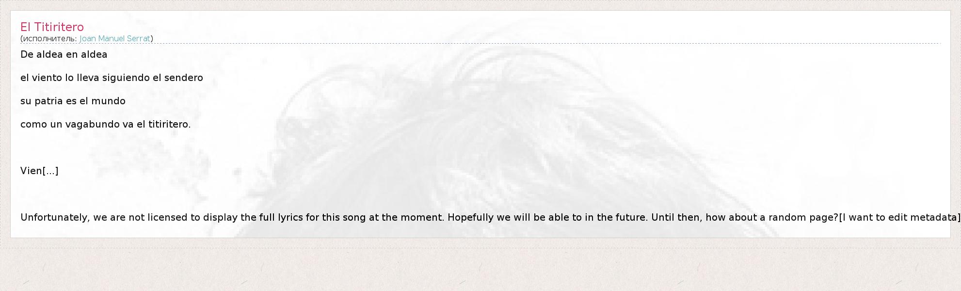 De aldea en aldea el viento lo lleva siguiendo el sendero su patria es el mundo como un vagabundo va el titiritero. Vien[...] Unfortunately, we are not licensed to display the full lyrics for this song at the moment. Hopefully we will be able to in the future. Until then, how about a random page?[I want to edit metadata]
