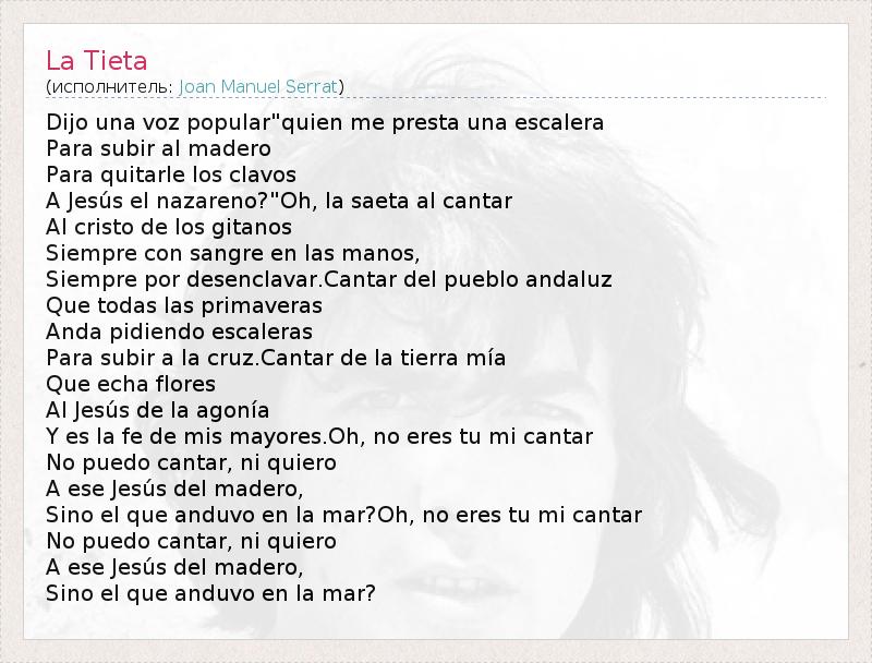 Dijo una voz popular"quien me presta una escalera Para subir al madero Para quitarle los clavos A Jesús el nazareno?"Oh, la saeta al cantar Al cristo de los gitanos Siempre con sangre en las manos, Siempre por desenclavar.Cantar del pueblo andaluz Que todas las primaveras Anda pidiendo escaleras Para subir a la cruz.Cantar de la tierra mía Que echa flores Al Jesús de la agonía Y es la fe de mis mayores.Oh, no eres tu mi cantar No puedo cantar, ni quiero A ese Jesús del madero, Sino el que anduvo en la mar?Oh, no eres tu mi cantar No puedo cantar, ni quiero A ese Jesús del madero, Sino el que anduvo en la mar?