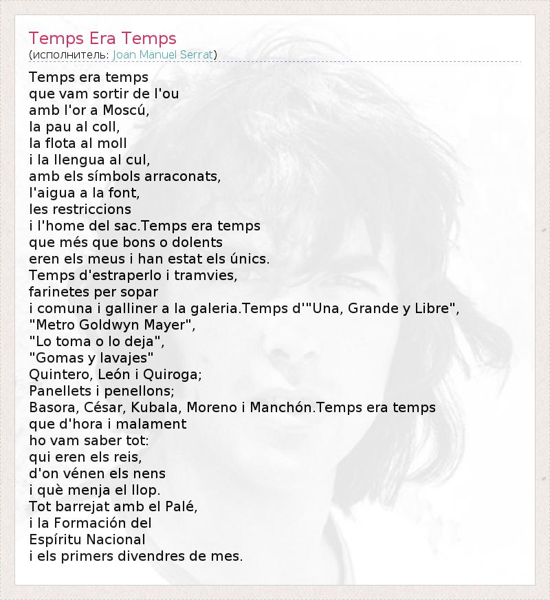 Temps era temps que vam sortir de l'ou amb l'or a Moscú, la pau al coll, la flota al moll i la llengua al cul, amb els símbols arraconats, l'aigua a la font, les restriccions i l'home del sac.Temps era temps que més que bons o dolents eren els meus i han estat els únics. Temps d'estraperlo i tramvies, farinetes per sopar i comuna i galliner a la galeria.Temps d'"Una, Grande y Libre", "Metro Goldwyn Mayer", "Lo toma o lo deja", "Gomas y lavajes" Quintero, León i Quiroga; Panellets i penellons; Basora, César, Kubala, Moreno i Manchón.Temps era temps que d'hora i malament ho vam saber tot: qui eren els reis, d'on vénen els nens i què menja el llop. Tot barrejat amb el Palé, i la Formación del Espíritu Nacional i els primers divendres de mes.