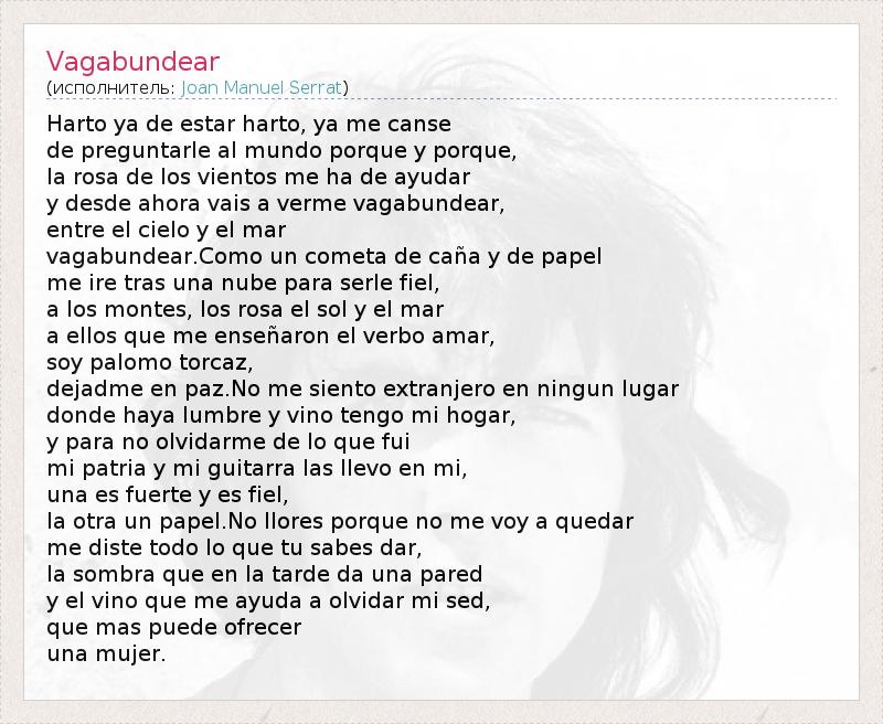 Harto ya de estar harto, ya me canse de preguntarle al mundo porque y porque, la rosa de los vientos me ha de ayudar y desde ahora vais a verme vagabundear, entre el cielo y el mar vagabundear.Como un cometa de caña y de papel me ire tras una nube para serle fiel, a los montes, los rosa el sol y el mar a ellos que me enseñaron el verbo amar, soy palomo torcaz, dejadme en paz.No me siento extranjero en ningun lugar donde haya lumbre y vino tengo mi hogar, y para no olvidarme de lo que fui mi patria y mi guitarra las llevo en mi, una es fuerte y es fiel, la otra un papel.No llores porque no me voy a quedar me diste todo lo que tu sabes dar, la sombra que en la tarde da una pared y el vino que me ayuda a olvidar mi sed, que mas puede ofrecer una mujer.